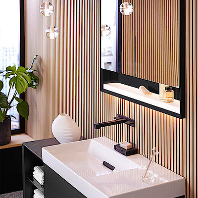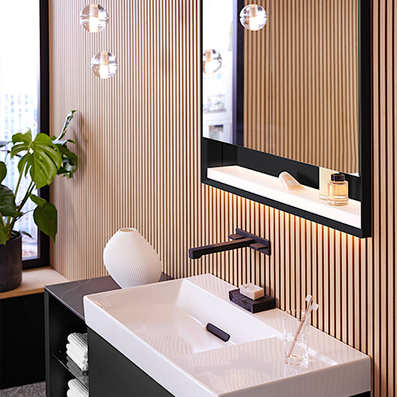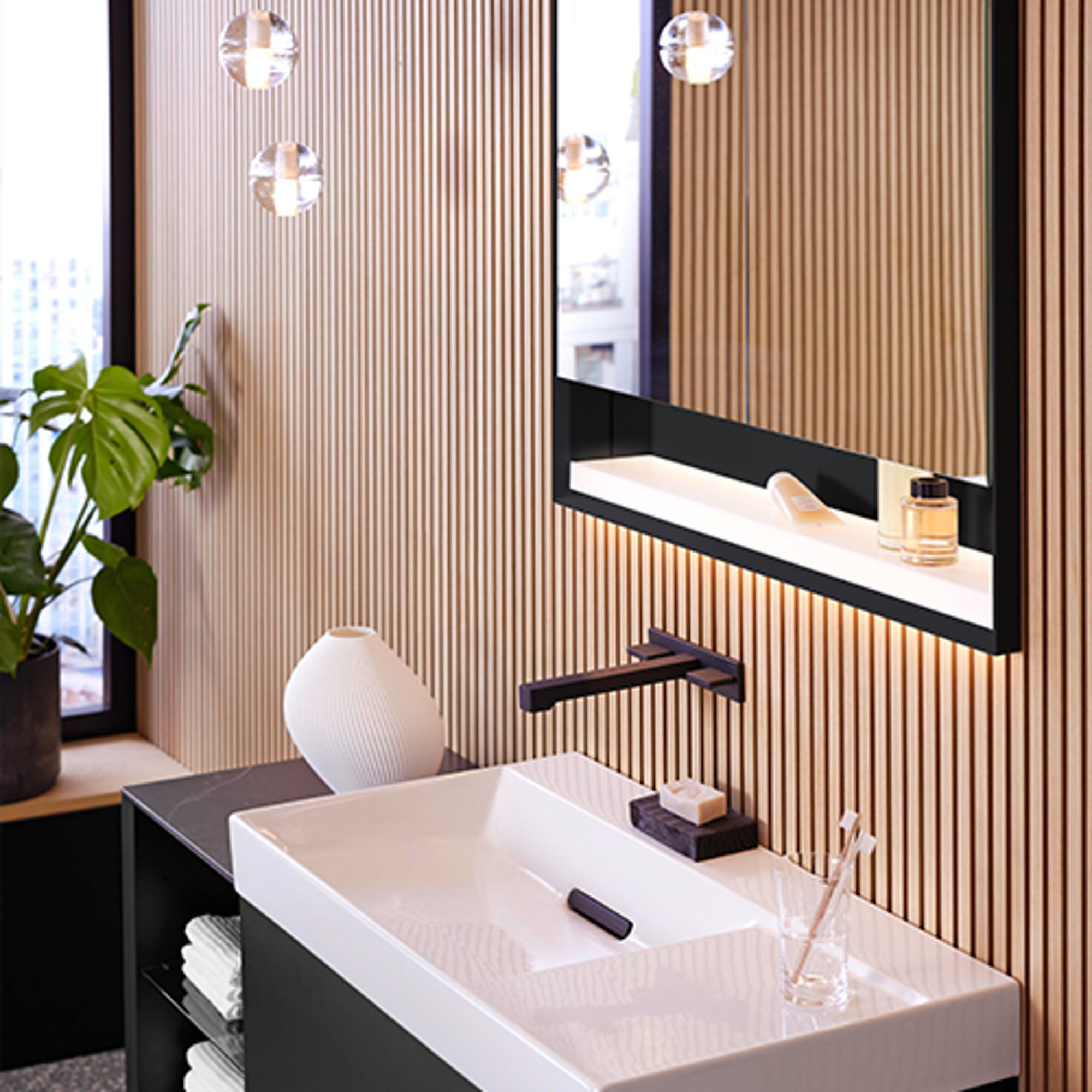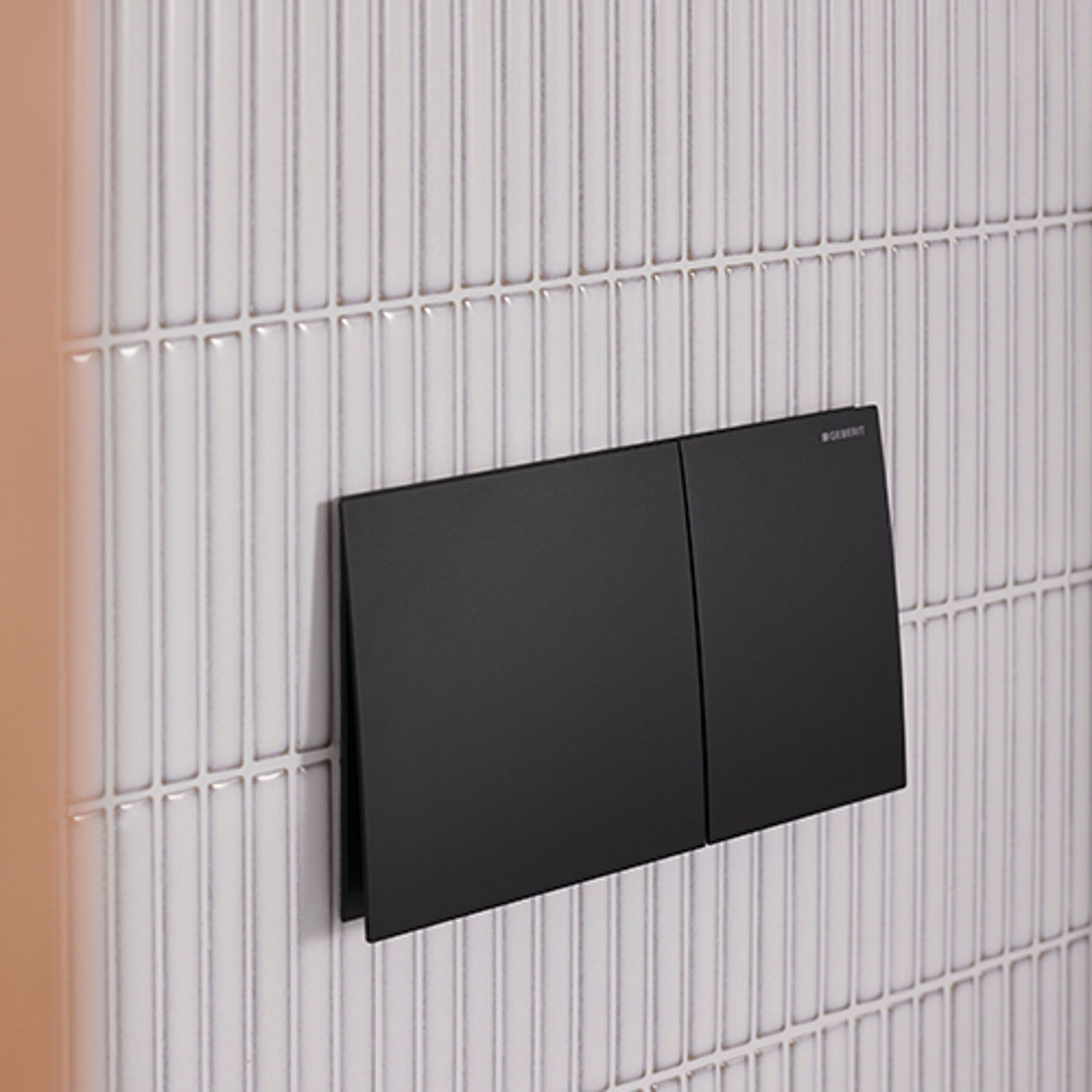 Zusätzlich gibt es nun eine große Auswahl an schwarzen WC-Betätigungsplatten, Urinalauslösungen und Armaturen in Schwarz matt, wie beispielsweise die berührungslosen Armaturen Geberit Brenta und Piave. Auch Duschrinnen, die Abdeckungen von Waschbecken- und Duschabläufen sowie Handtuchhalter und Waschtisch-Siphons sind jetzt in dieser Farbe erhältlich. Zudem gibt es verschiedene Spiegel und Spiegelschränke in Schwarz matt, zum Beispiel die Unterputzvariante des Geberit ONE Spiegelschranks