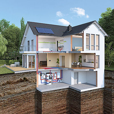 Nutzen Sie die Sonnenenergie gleich doppelt: In der Kombination mit einer Solarthermie-Anlage lässt sich die Solarwärme direkt in den Heizkreiskreislauf einspeisen, in der Regel wird sie in einem Solarspeicher zwischengelagert. Wenn der Solarspeicher gefüllt ist, wird überschüssige Solarwärme zum Beispiel ins Erdreich geführt, so dass dieses nicht zu sehr auskühlt.