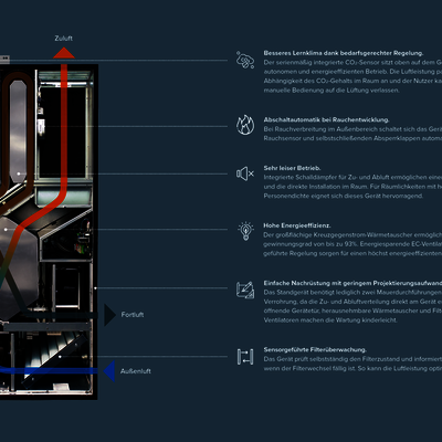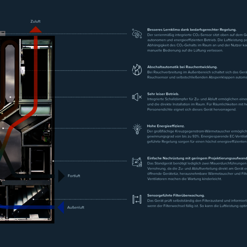 Sich unbekümmert mit frischer und gesunder Luft versorgen lassen. Die Bedienmöglichkeiten des airDIRECT Lüftungsgeräts lassen den Nutzern in Schulen, Kindergärten und Büros freie Wahl. Der Facility Manager kann beispielsweise alle Geräte im Gebäude beliebig und zentral steuern. In jedem Fall haben alle Beteiligten die Möglichkeit, sich voll und ganz auf die Sensortechnik zu verlassen, die das Gerät in Abhängigkeit des CO2-Gehalts im Raum von ganz allein steuert. Das Lern- und Arbeitsklima wird somit in keiner Weise gestört – im Gegenteil, die Produktivität steigt mit frischer Raumluft!