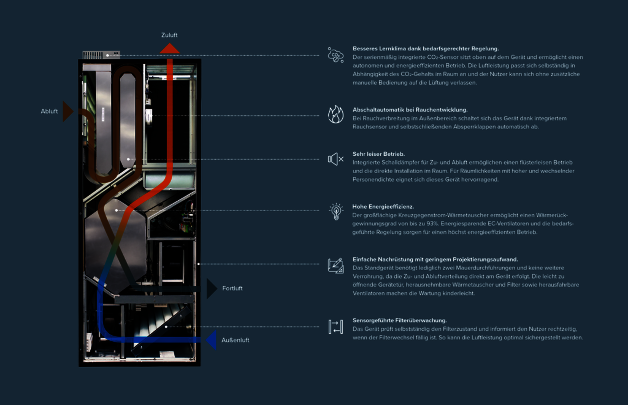Vor allem Schulen und Kindergärten, aber auch Arbeitgeber und Veranstalter, benötigen nach wie vor schnelle Lösungen für den sicheren Aufenthalt in Innenräumen. Das neue airDIRECT 750 CC von VALLOX lässt sich schnell und einfach nachrüsten, es wird dezentral im Raum installiert und benötigt keine aufwendige Rohrverlegung in Boden oder Decke. Lediglich zwei Mauerdurchführungen für Zu- und Abluft sorgen mit einer hohen Luftleistung von 770 m³/h für den notwendigen Luftaustausch – dank integrierten Schalldämmkonzept ganz ohne Störgeräusche. Das Gerät eignet sich daher ideal für Räume mit hoher und wechselnder Personendichte (Klassenzimmer, Büros, Warteräume). Mit einer effizienten Wärmerückgewinnung von 93 Prozent wird ein erheblicher Anteil an Heizkosten gespart und damit auch ein Beitrag zum Klimaschutz geleistet.