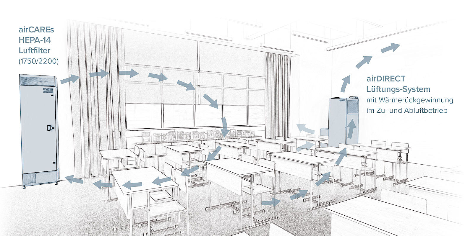 VALLOX hat für alle Raumsituationen passende Lüftungs- und Luftfiltersysteme im Programm. Die Systeme sind je nach Bedarf sinnvoll miteinander kombinierbar, das heißt, eine Systemintegration erfolgt ohne hohen Planungs- und Installationsaufwand. Durch die Kombination von Luftreinigung im Umluftbetrieb, sog. Luftfiltergeräte (mit Hepa-Hochleistungsfilter der Klasse H14) und einem Lüftungsgerät, das frische Luft von draußen gefiltert in den Raum bringt, reduzieren Schulen und Kindergärten das Infektionsrisiko auf ein Minimum.