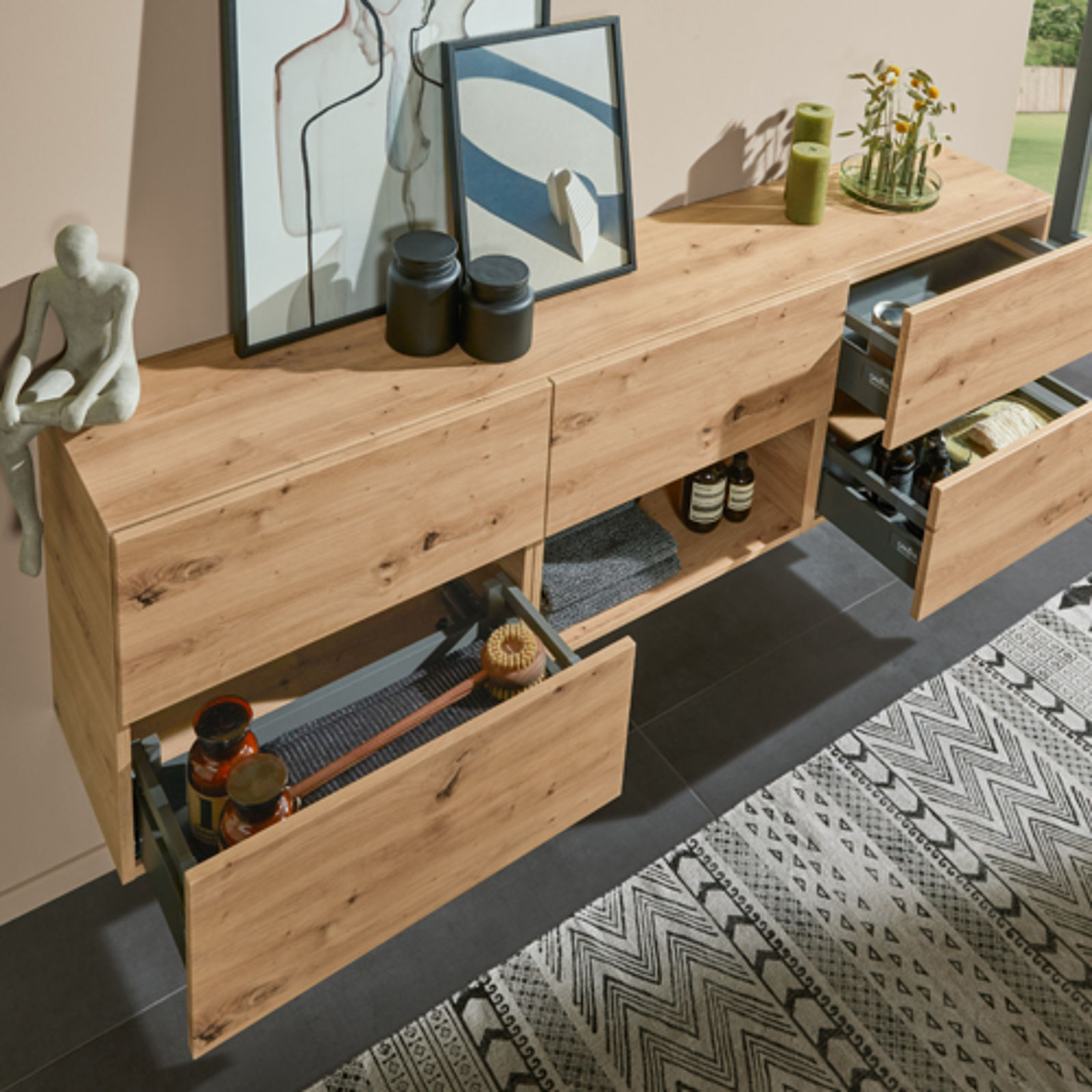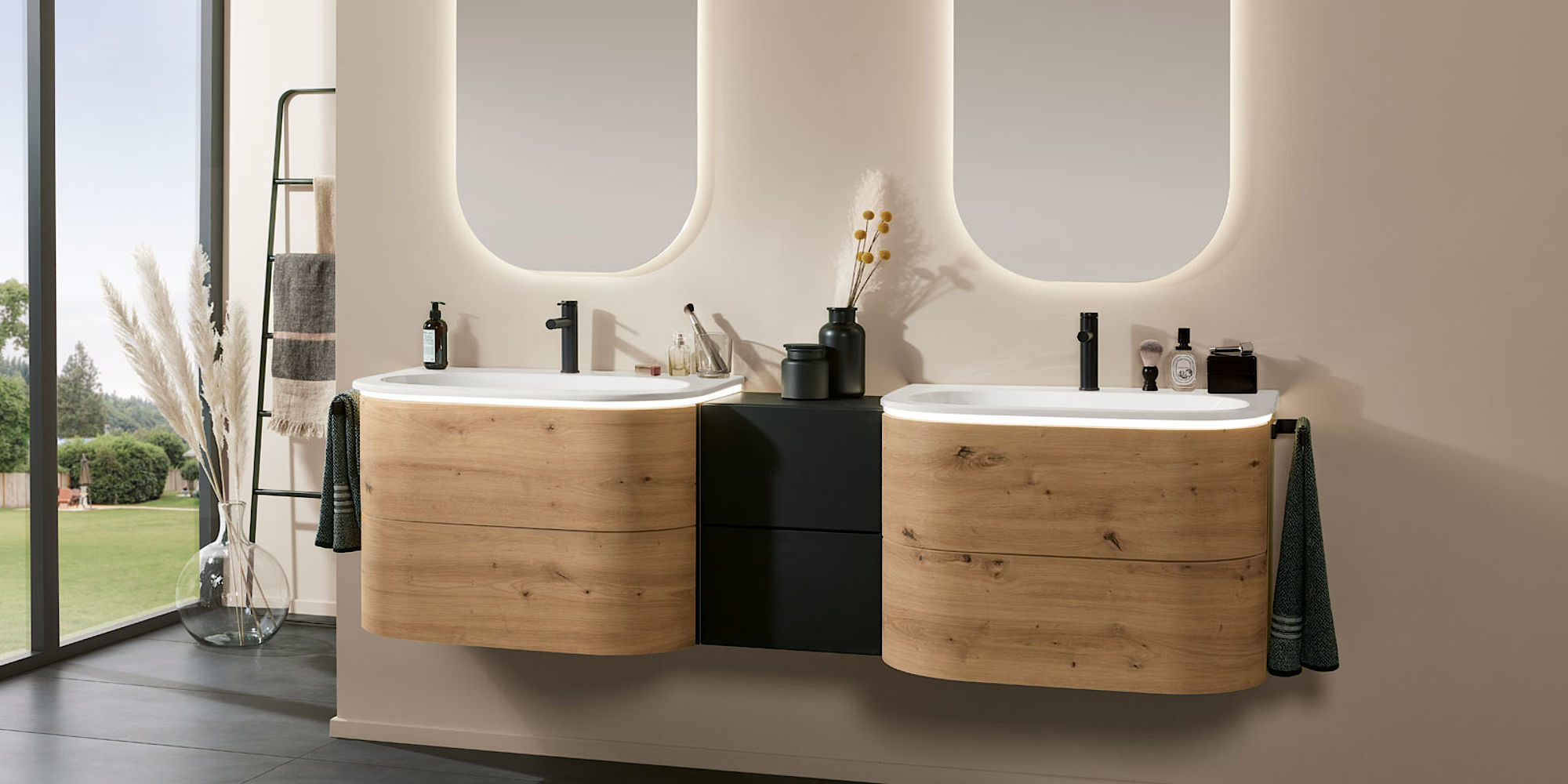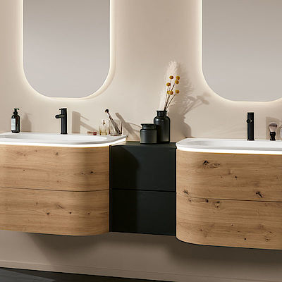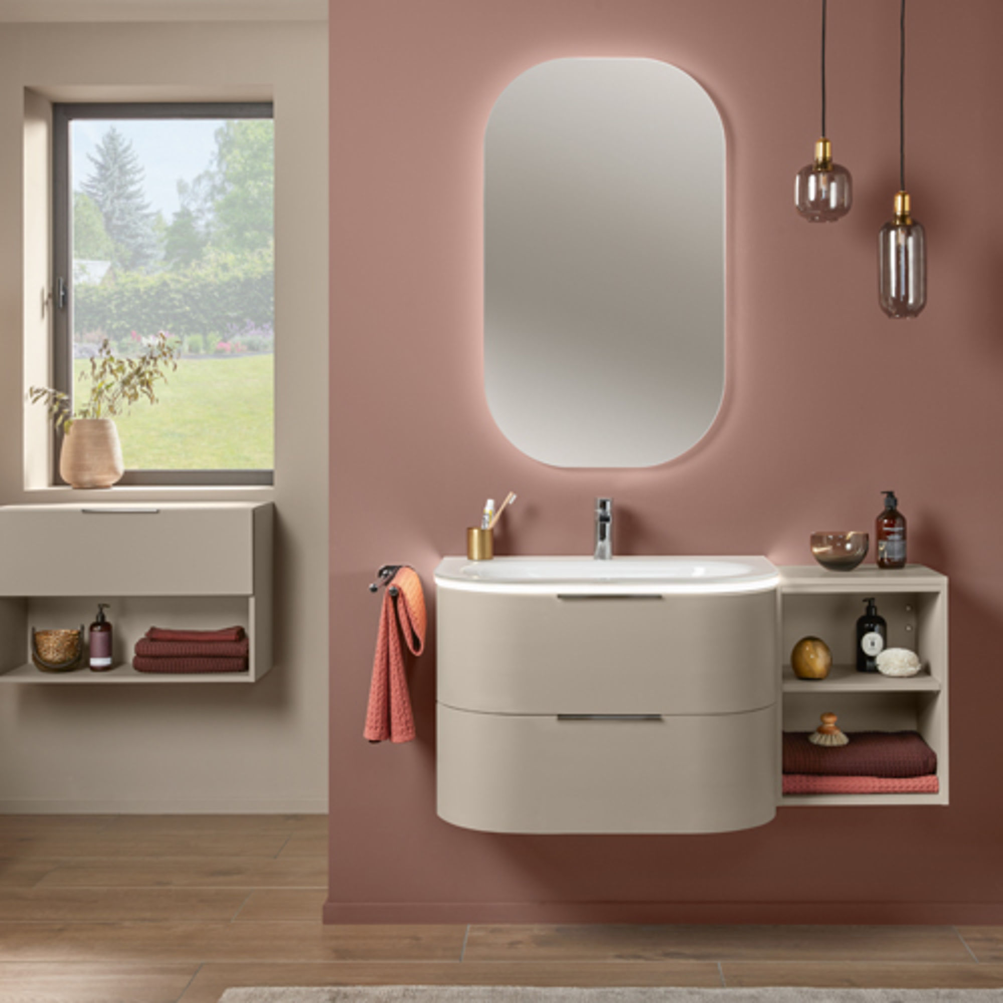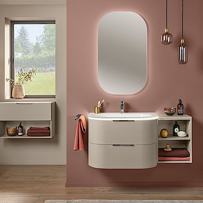 Kernstück der Kollektion ist der Waschplatz, an dem Unterschrank und Waschtisch mit ihren konsequent ovalen Formen eine harmonische Einheit bilden: Die schlichten, wahlweise grifflosen Fronten, unterstreichen das zeitlose und ruhige Erscheinungsbild der Kollektion. Der 80 cm breite Unterschrank bietet mit zwei gleichgroßen, innen in modernem Anthrazit gehaltenen Vollauszügen jede Menge praktischen Stauraum für die täglichen Badutensilien. Dank integriertem Anti-Rutschboden lässt sich alles sicher und ordentlich verstauen. Wer mehr Platz benötigt, ergänzt ihn um die zurückversetzten Anbauschränke der Serie, die eine gute Raumökonomie – insbesondere in kleinen und mittleren Bädern bieten. Die Schränke sind in Varianten mit offenen Fächern, Auszügen oder einer Tür erhältlich, so dass sich damit unterschiedliche Lösungen realisieren lassen. Verfügbar sind die Breiten 40 cm und 80 cm Breite sowie maßflexible Varianten. Schrankmodelle aus der Serie 3way und die universellen Cube-Regalelemente eröffnen weitere Einrichtungsmöglichkeiten.