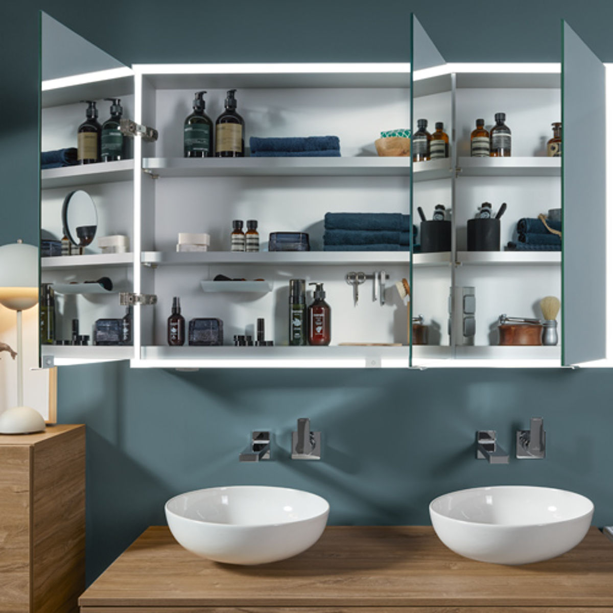 Die beiden neuen Spiegelschränke Milo und Wim aus der Serie Reflection bieten zusätzlichen Stauraum. Sie besitzen praktische Features wie ein komplett umlaufendes LED-Band für die perfekte Ausleuchtung auch im Innern des Schrankes, filigrane Griffe zum Öffnen ohne Fingerabdrücke und einen außenliegenden Sensorschalter mit Emotionfunktion zur Einstellung von Helligkeit und Lichtfarbe von Warmweiß bis Kaltweiß.