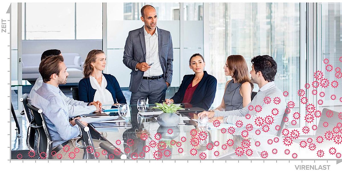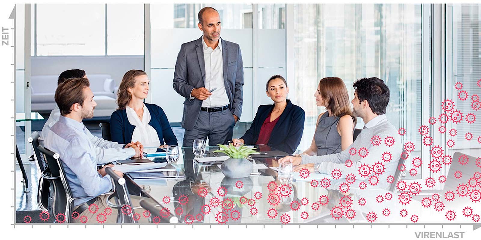 Beim Sprechen und Atmen sammeln sich naturgemäß winzigste Flüssigkeitspartikel, sog. Aerosole, in der Luft an. Diese Aerosole können Viren transportieren. Für Covid-19 sind Aerosole hauptsächlicher Übertragungsweg. So können mit Viren belastete Flüssigkeitspartikel bis zu mehreren Stunden in der Raumluft schweben. Regelmäßiges Fensterlüften, bestenfalls mit Durchzug, kann dabei gut Abhilfe schaffen. Wirklich effizient und nachhaltig sind diese Varianten laut Robert-Koch-Institut jedoch nicht.