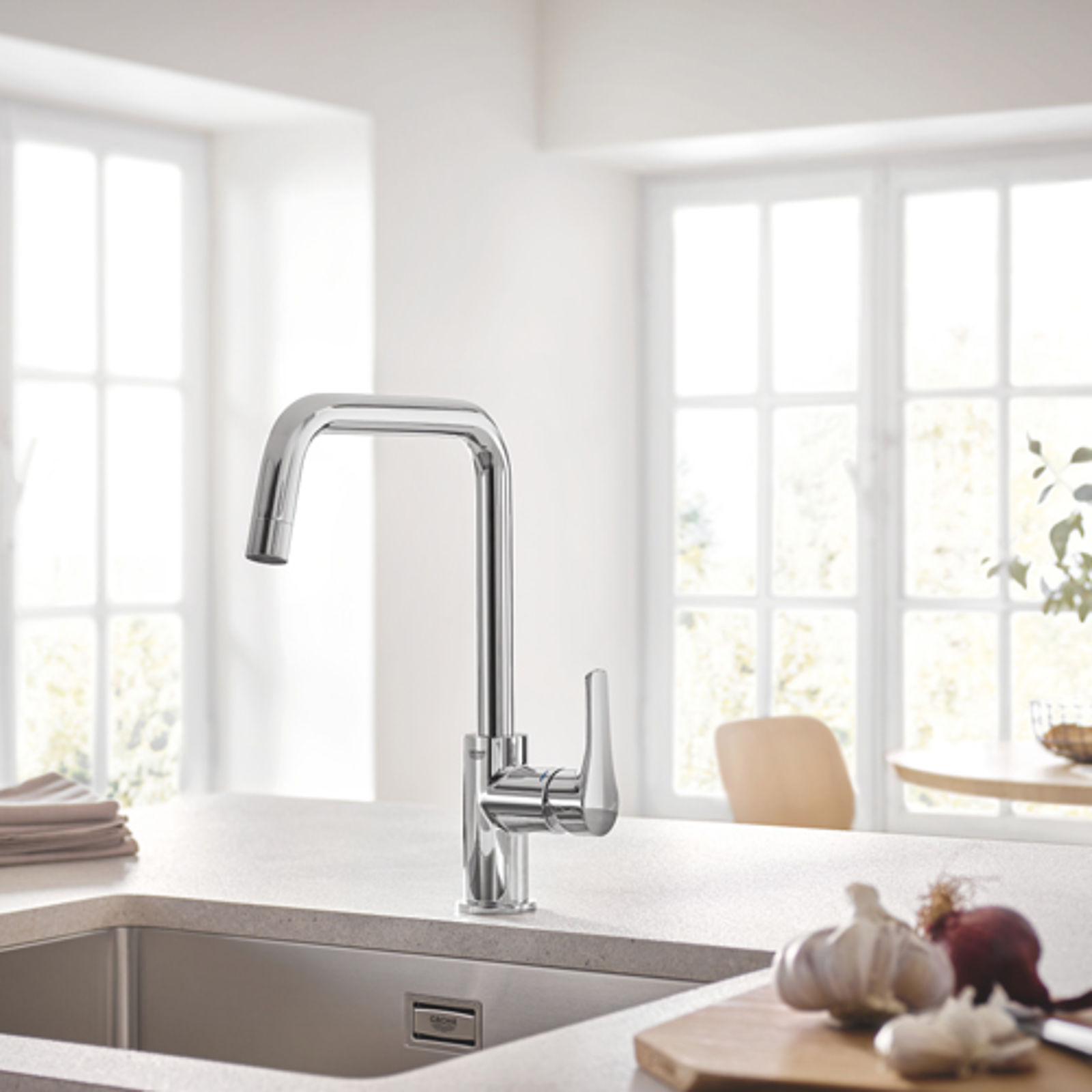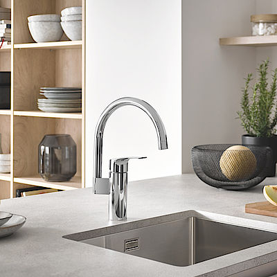 GROHE Eurosmart beweist, dass Funktionalität ein modernes Design nicht ausschließt. Die Eurosmart Küchenarmatur ist in zwei eleganten Ausführungen mit U- und C-geformten Ausläufen erhältlich und durch die Starlight-Oberfläche extrem langlebig. Des Weiteren sind einige Eurosmart Varianten mit nachhaltigen Technologien wie GROHE SilkMove ES oder GROHE EcoJoy ausgestattet, die im Vergleich zu regulären Armaturen beim Energie- und Wassersparen helfen.