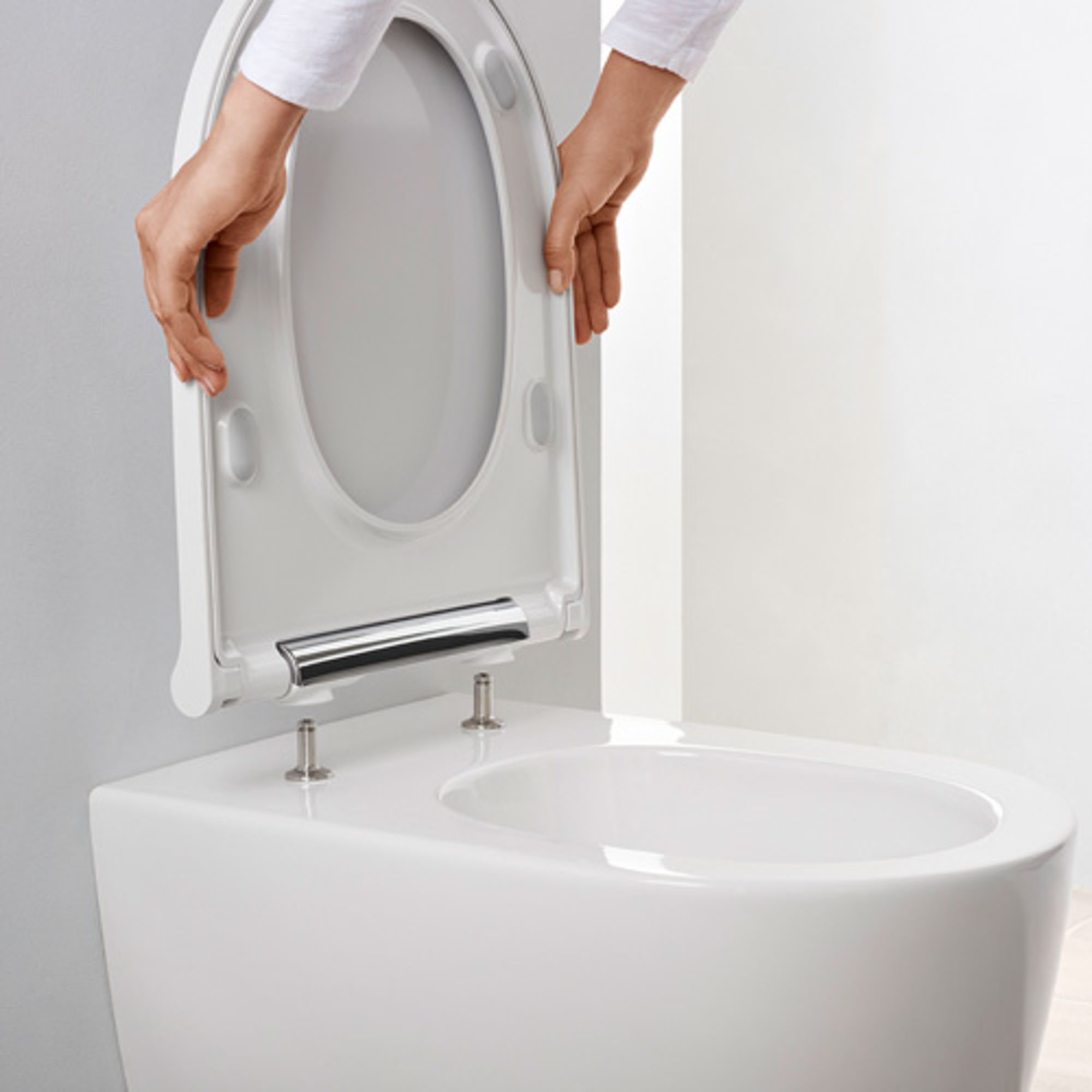 Diese Regeln sind für die Hygiene im Bad entscheidend. Bei den Reinigungsmitteln gilt die Devise: Milder ist besser – auch in punkto Hygiene. Denn das schont die Oberflächen. Falls hartnäckige Beläge ihr Unwesen treiben, kannst du immer noch mit den passenden schärferen Reinigern aufwarten. Wer es langfristig einfacher haben möchte, der investiert in eine Rimfree-WC-Keramik, die ganz ohne Spülrand auskommt, oder in einen abnehmbaren Toilettensitz, wie etwa beim WC der Geberit ONE Badserie.