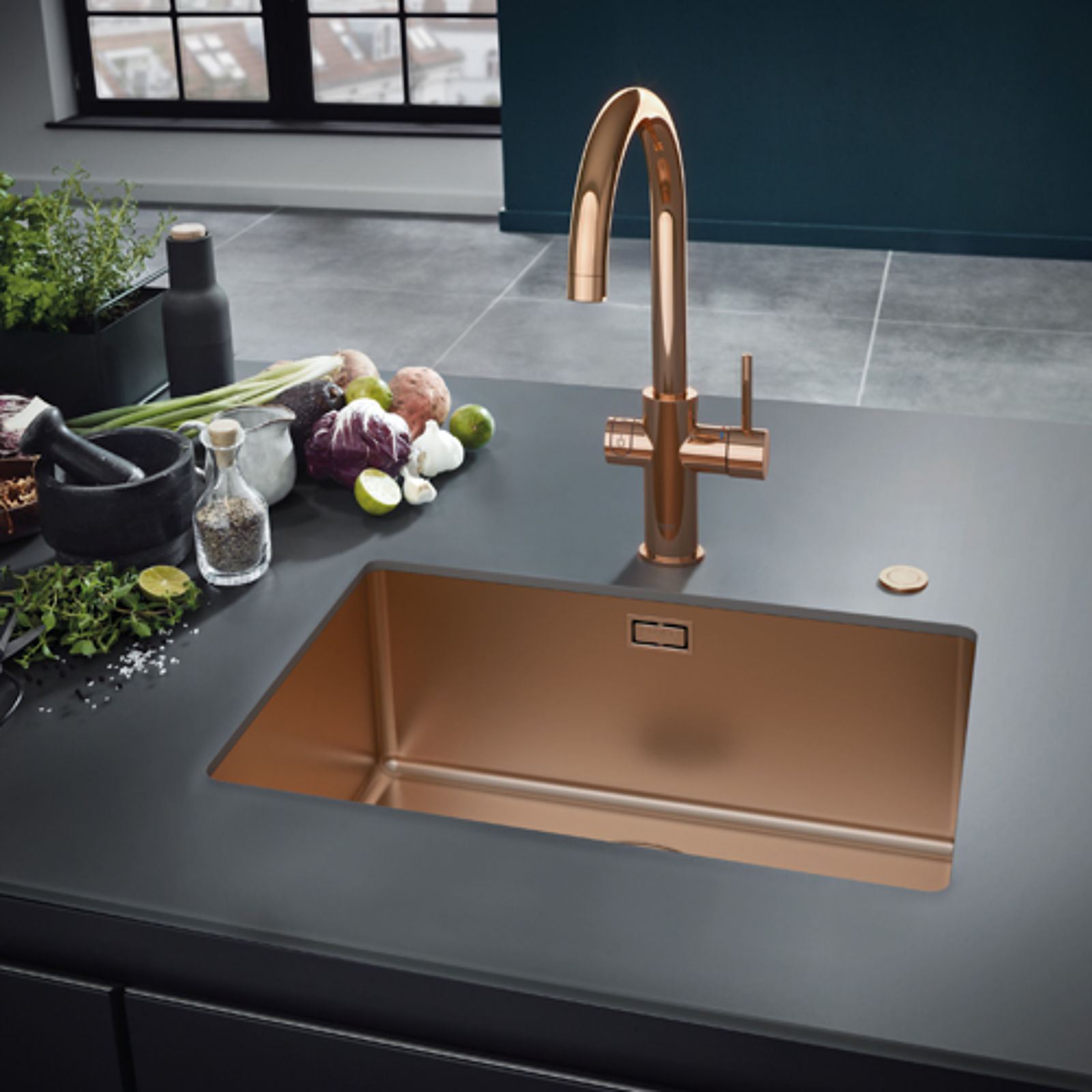 GROHE Blue beweist, dass sich nachhaltige Technologien und ein modernes Design nicht ausschließen. Die Armatur ist in drei eleganten Ausführungen mit L-, C- oder U-geformtem Auslauf erhältlich und setzt in den Oberflächen SuperSteel, Chrom, Hard Graphite und Warm Sunset gekonnt Akzente an der Spüle.