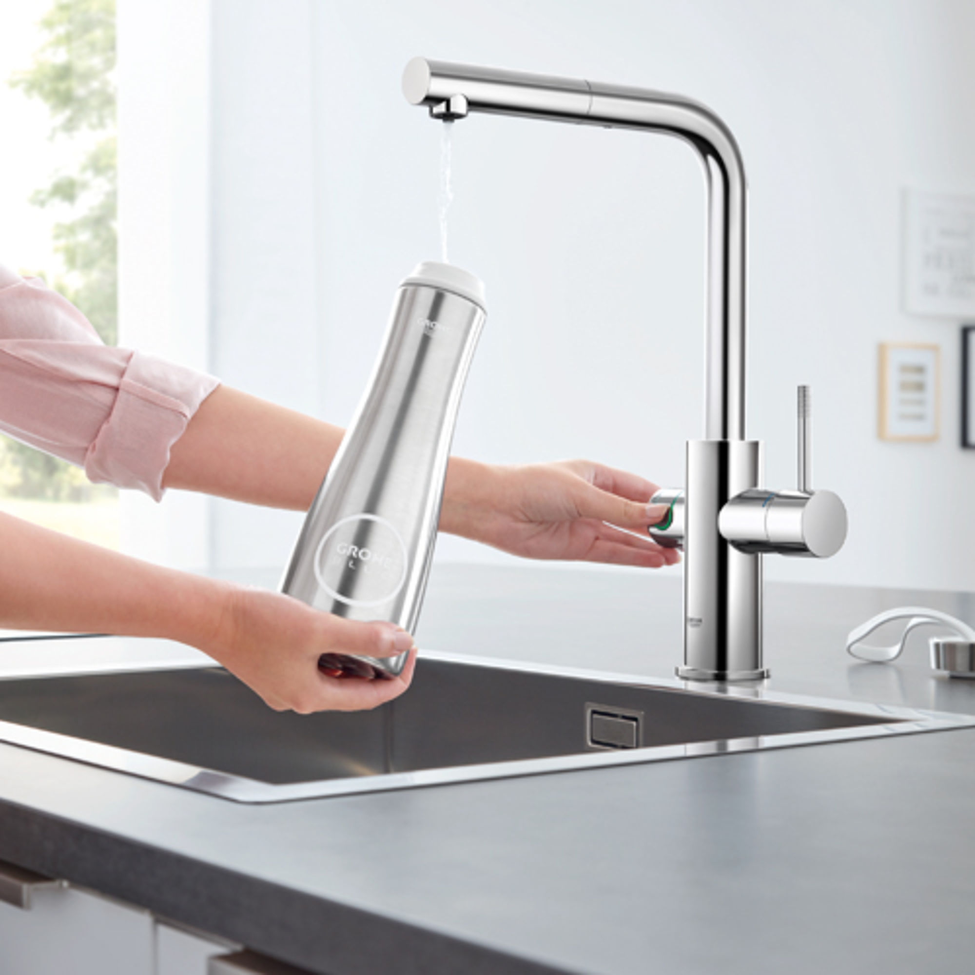 GROHE Blue steht für zeitgemäßen und nachhaltigen Wassergenuss. Mit dem innovativen Wassersystem können Sie gefiltertes, angenehm gekühltes Trinkwasser in den Varianten still, medium oder sprudelnd direkt aus der attraktiven Küchenarmatur genießen. Ganz ohne Plastikflaschen und deren CO2-Emissionen durch Produktion und langer Transportwege. Das hat auch die Jury des Deutschen Nachhaltigkeitspreises überzeugt: 2021 zeichnete sie GROHE Blue für die Kombination aus Nachhaltigkeit und Design in der Kategorie „Ikonen“ aus.
