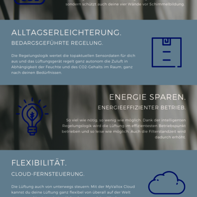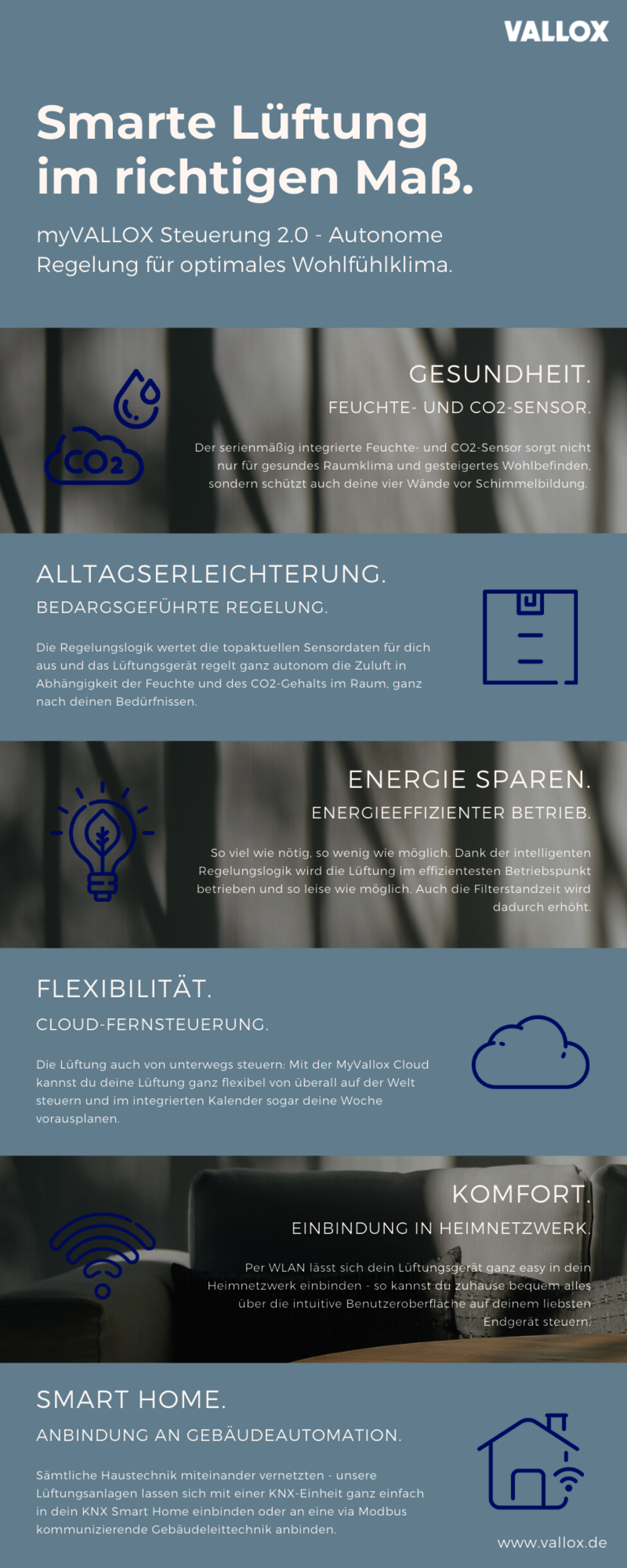 Automatisch gesteuert oder selbstbestimmt. Die myVALLOX Steuerung setzt neue Maßstäbe für smartes und energieeffizientes Lüften. Eine komplette Baureihe modernster und hocheffizienter Wand- und Deckengeräte aus der Professional Line lassen dir freie Wahl – ob Heimnetzwerk oder Fernsteuerung, einfacher 4-Stufenschalter, sensitives Grafik-Display oder Einbindung in die Gebäudeautomation. Sogar Fernwartung ist möglich.