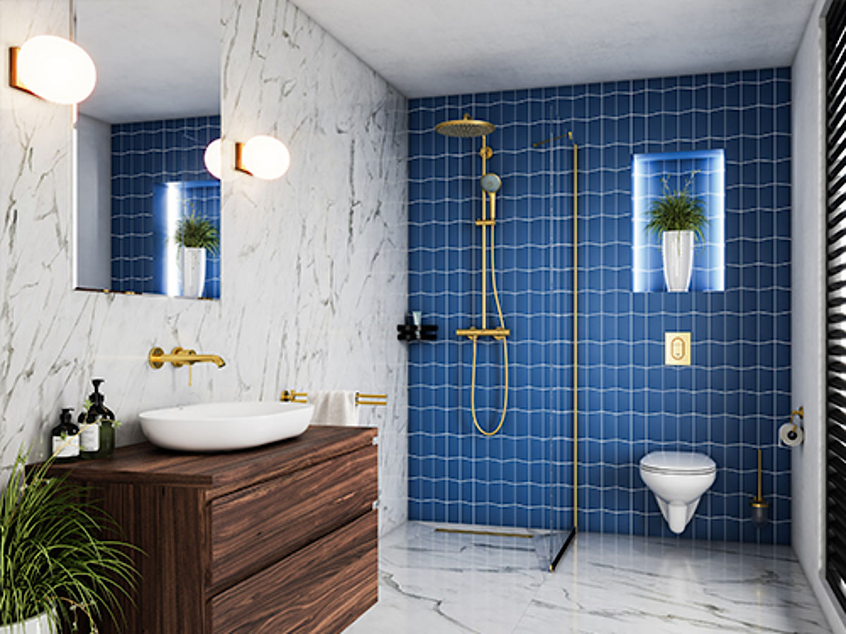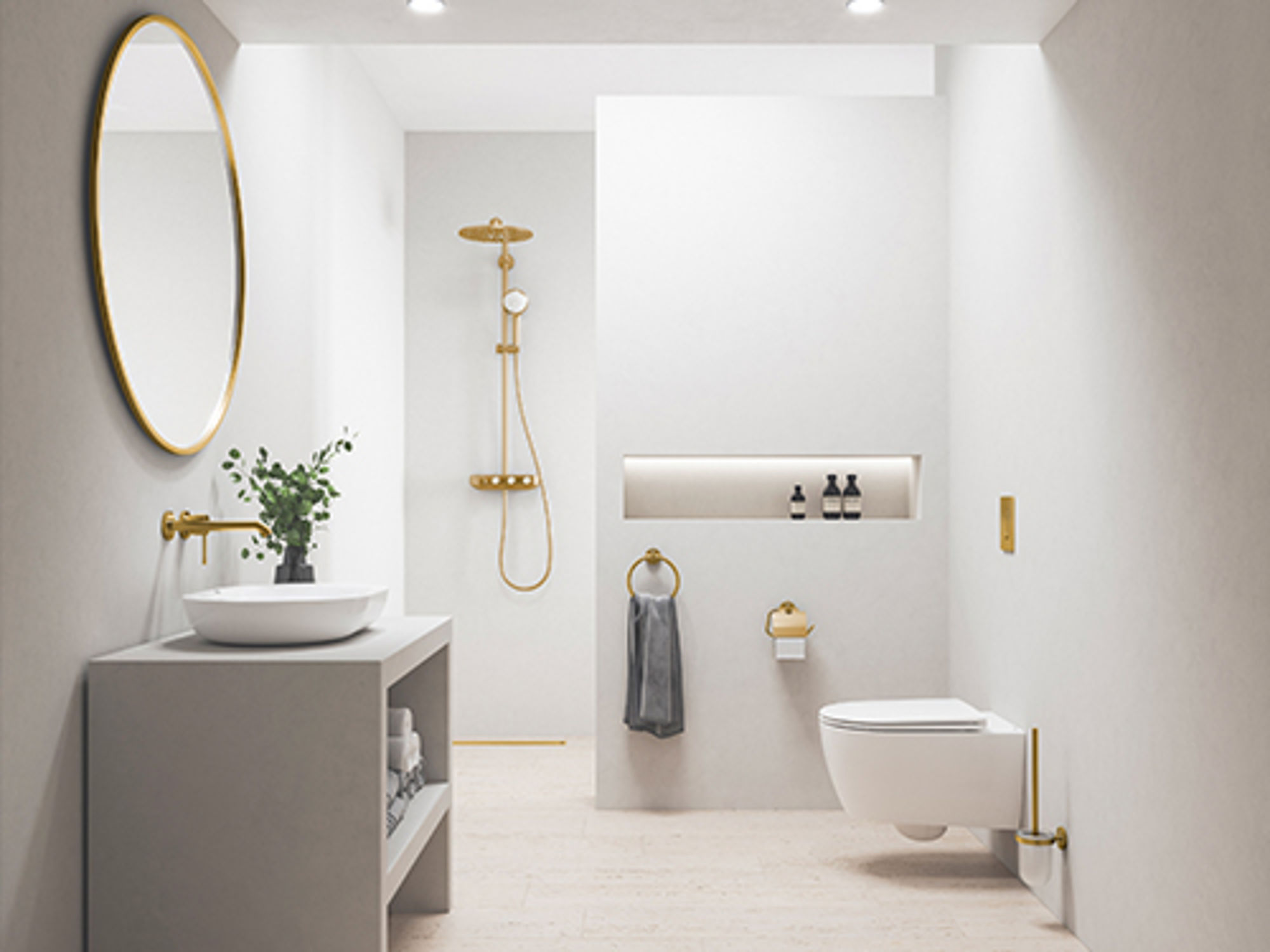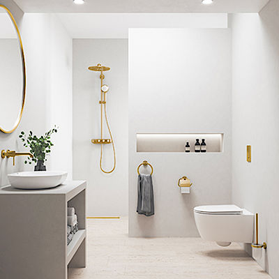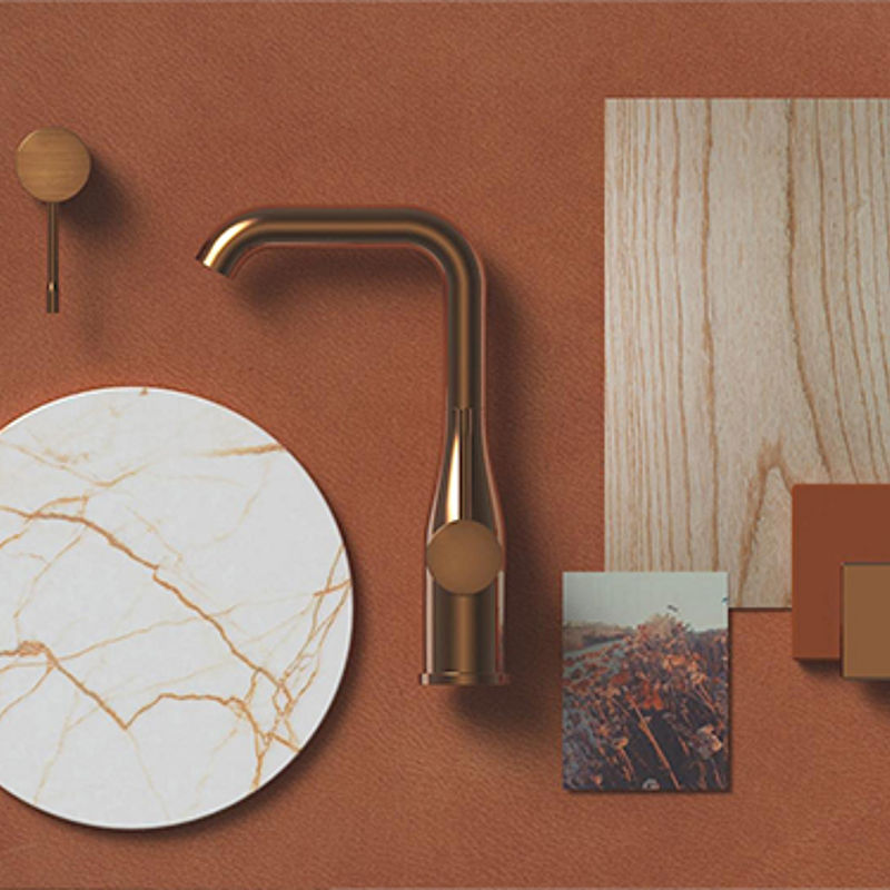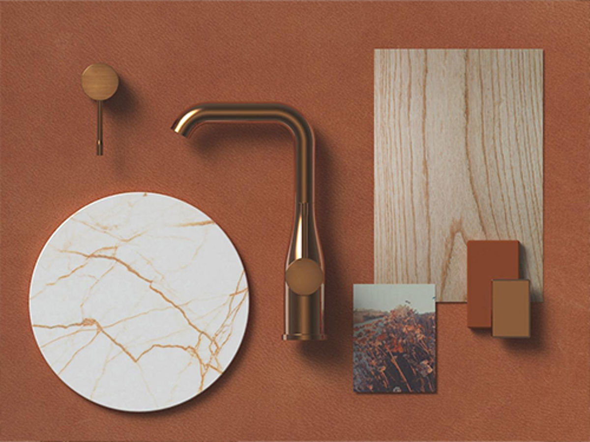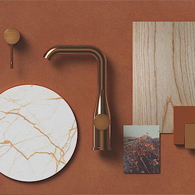 Warm Sunset setzt Akzente in originellen Badezimmerdesigns. Immer brillant, immer einzigartig. Der warme Roségold-Ton passt zu dunklem Stein, Marmor oder Beton sowie zu ungewöhnlichen Farben und Mustern. GROHE bietet eine Vielzahl von Produkten in Warm Sunset.