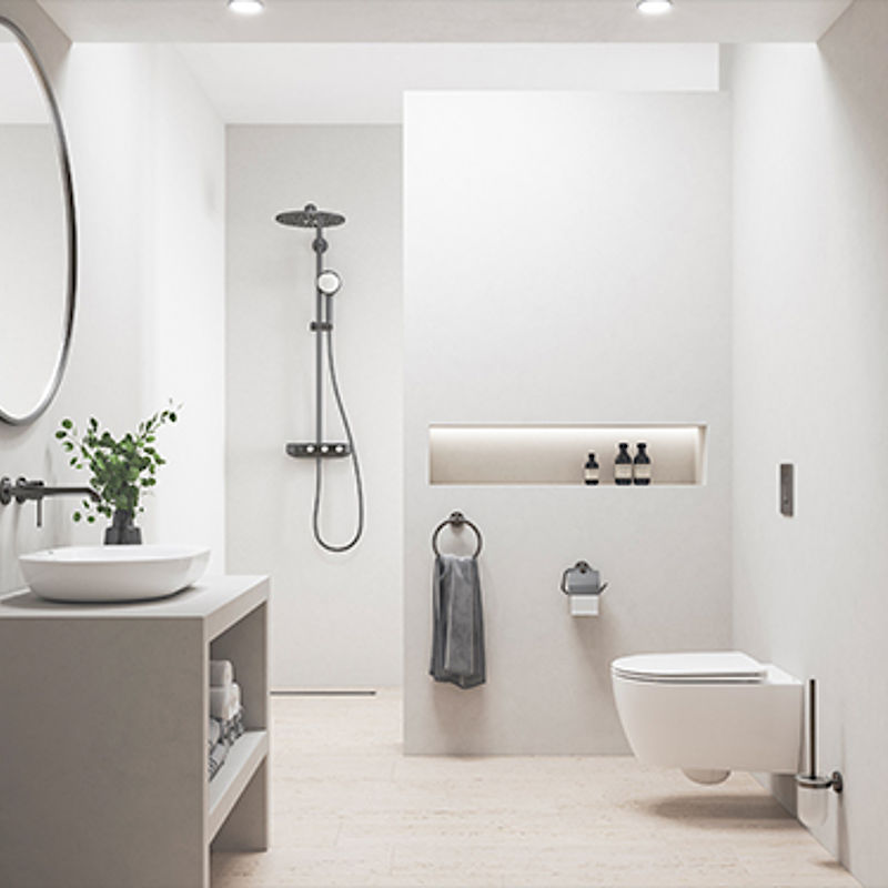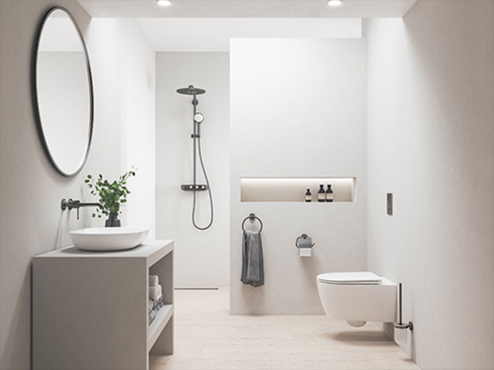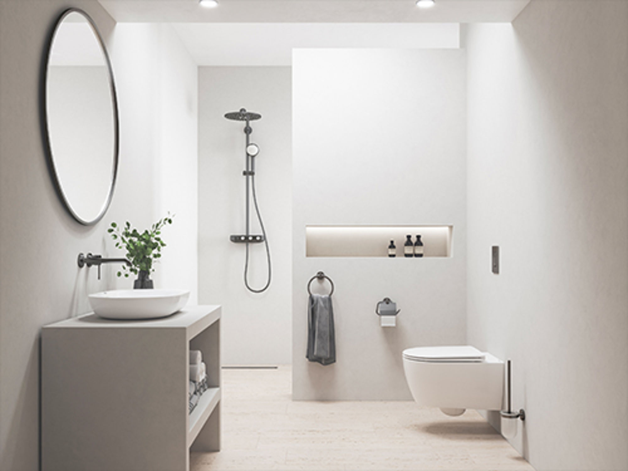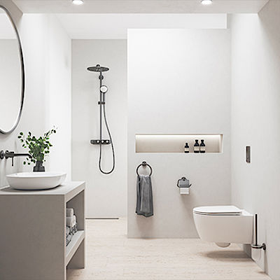 Kontrast zu einer rein weißen Badausstattung oder als Tarnung für eher dunkle Ton-in-Ton-Umgebungen? Hard Graphite ist in beiden Fällen eine hervorragende Wahl. Als Materialbegleiter sind Beton oder helles Holz empfehlenswert. Diese Kombination schafft eine ausgewogene Balance zwischen Modernität und Wärme, die Ihrem Badezimmer eine einladende Atmosphäre verleiht. In der Farbe Hard Graphite bietet GROHE eine umfangreiche Produktvielfalt an.