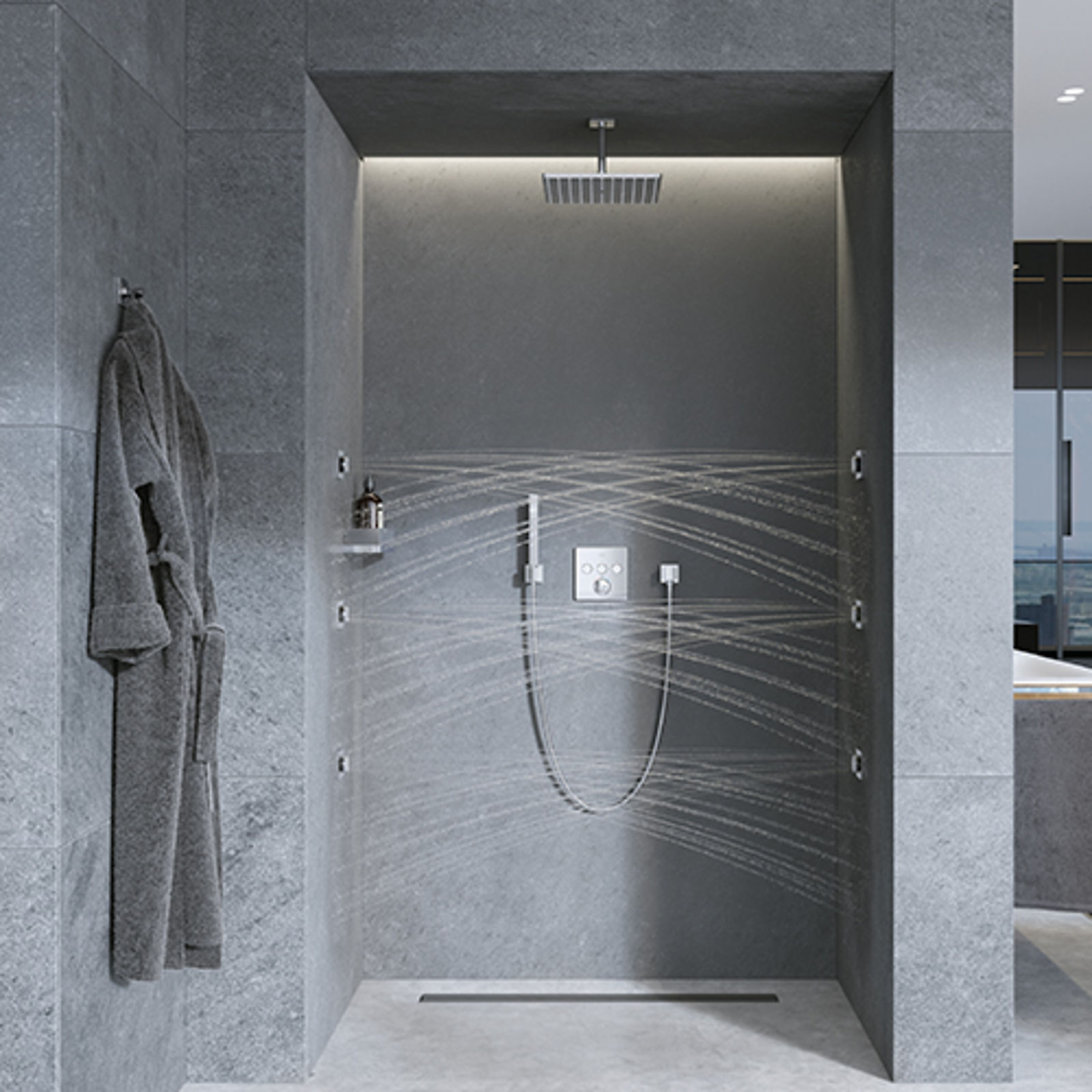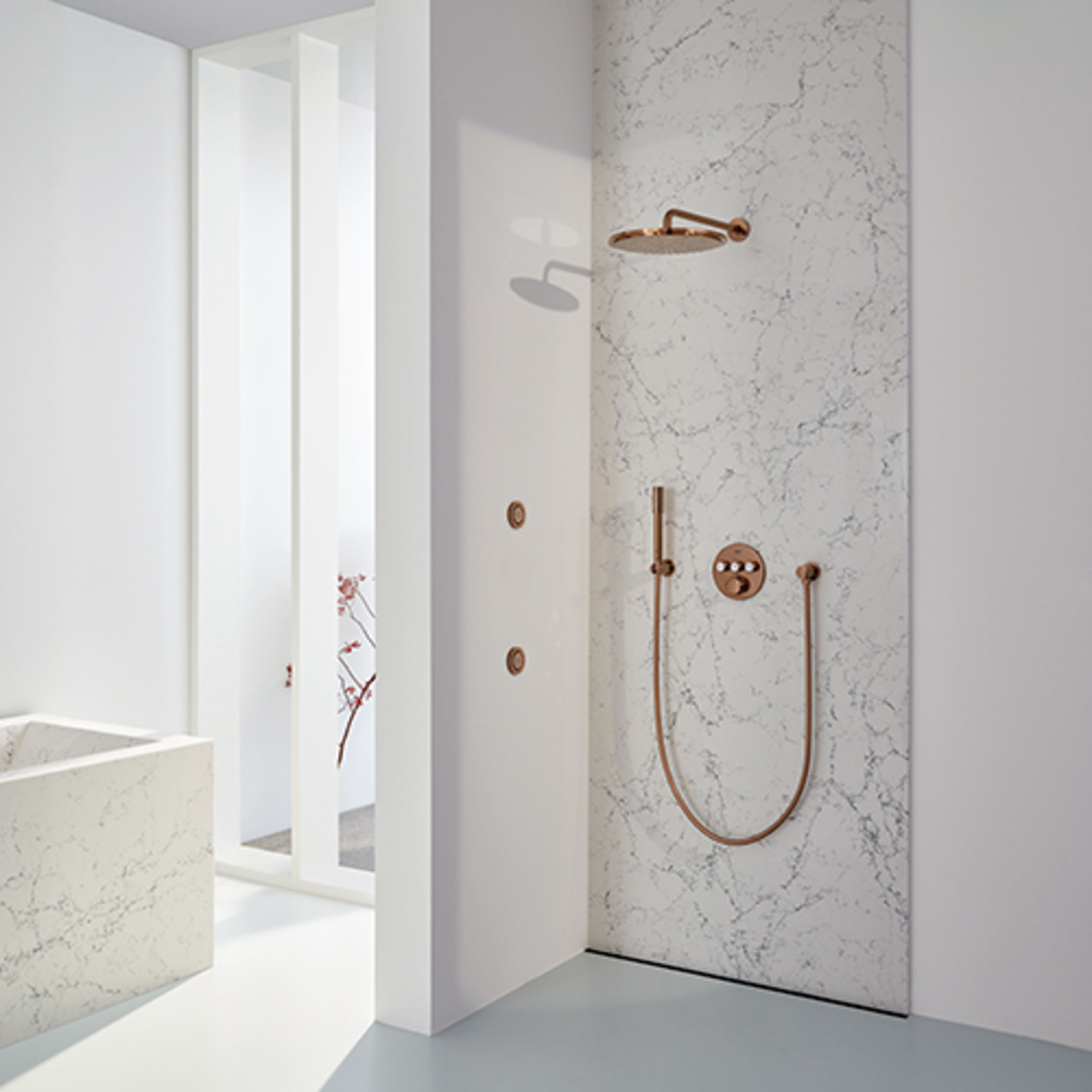 Die minimalistischen Module verfügen über unterschiedliche Strahlarten wie den GROHE PureRain Strahl und den stimulierenden TrioMassage Strahl, die auf Wunsch gleichzeitig aktiviert werden können. Die GROHE Rainshower Seitenbrausen komplettieren das Duscherlebnis mit einer pulsierenden Wassermassage.