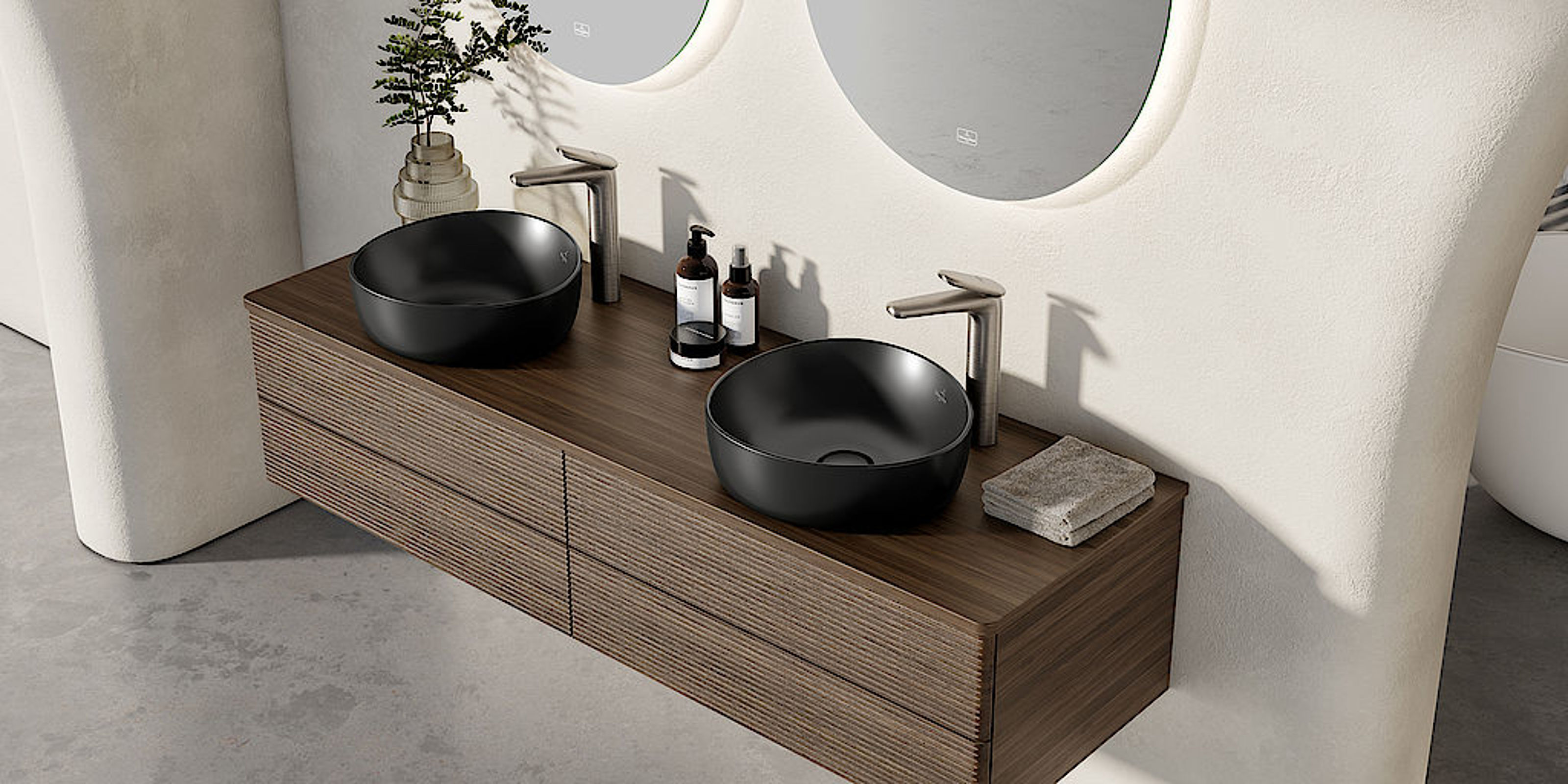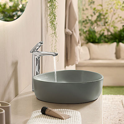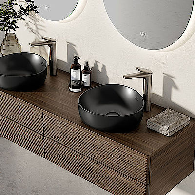 Am deutlichsten zu erkennen ist seine Form bei den Aufsatzwaschtischen: organisch mit einer leichten Asymmetrie, dabei völlig harmonisch und ausgewogen. Zusätzlich zu den Aufsatzwaschtischen in drei verschiedenen Größen von