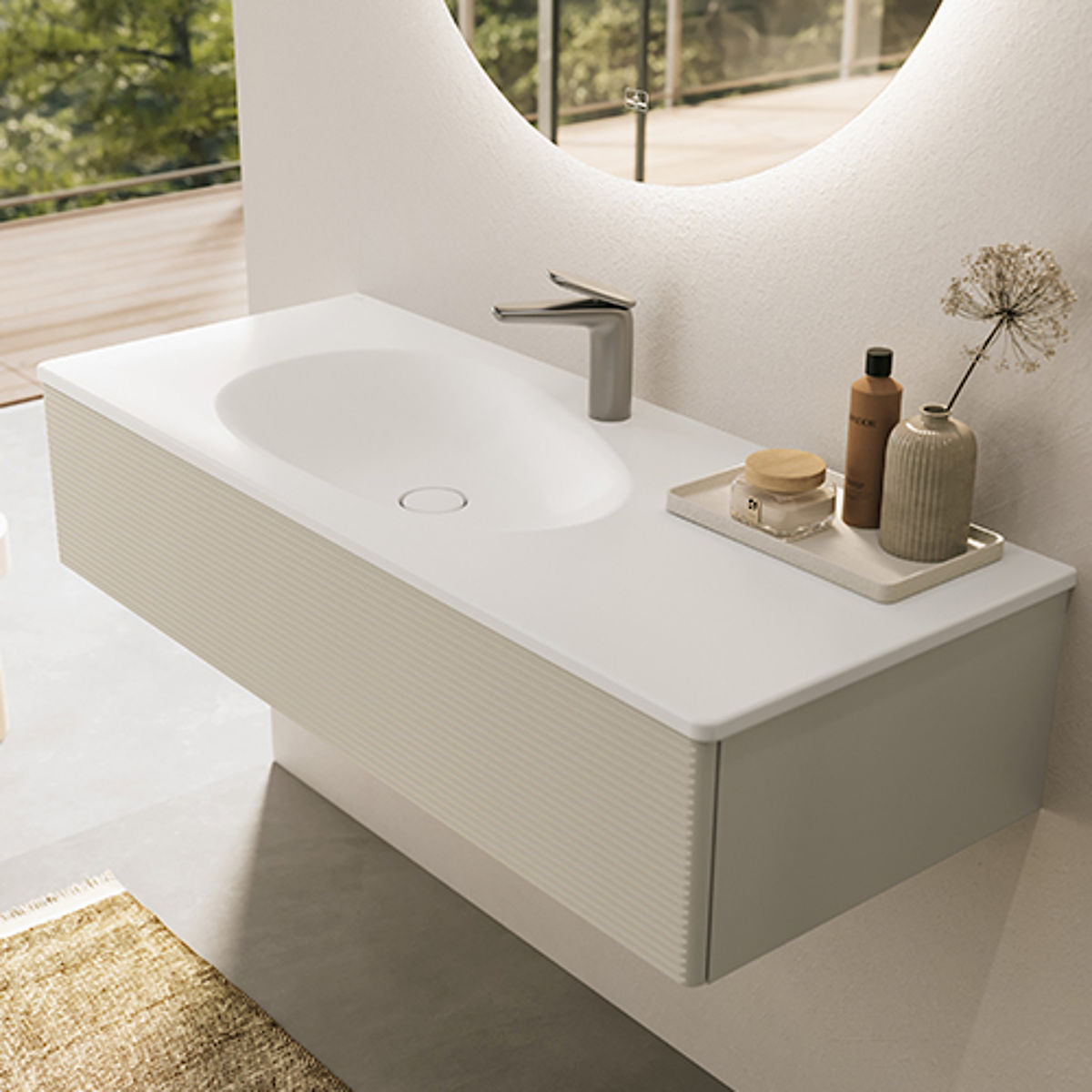 So eröffnet sie zum Beispiel geräumige Ablageflächen; der perfekte Ort für die passenden Antao Armaturen ergibt sich ebenfalls wie von selbst. Letztere spielen die Idee des Tautropfens mit ihren weichen Konturen und der einzigartigen Formgebung weiter durch und komplettieren die Kollektion