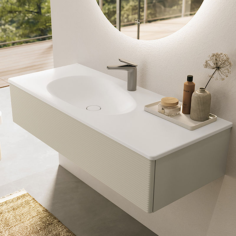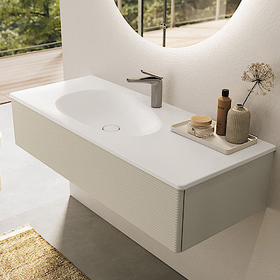 mit einem weich fließenden Übergang von der Ablage zum Becken. Das Besondere: So wie in der Natur kein Tautropfen dem anderen gleicht, wurde auch bei Antao für jede Waschtischgröße eine eigene Form entwickelt.