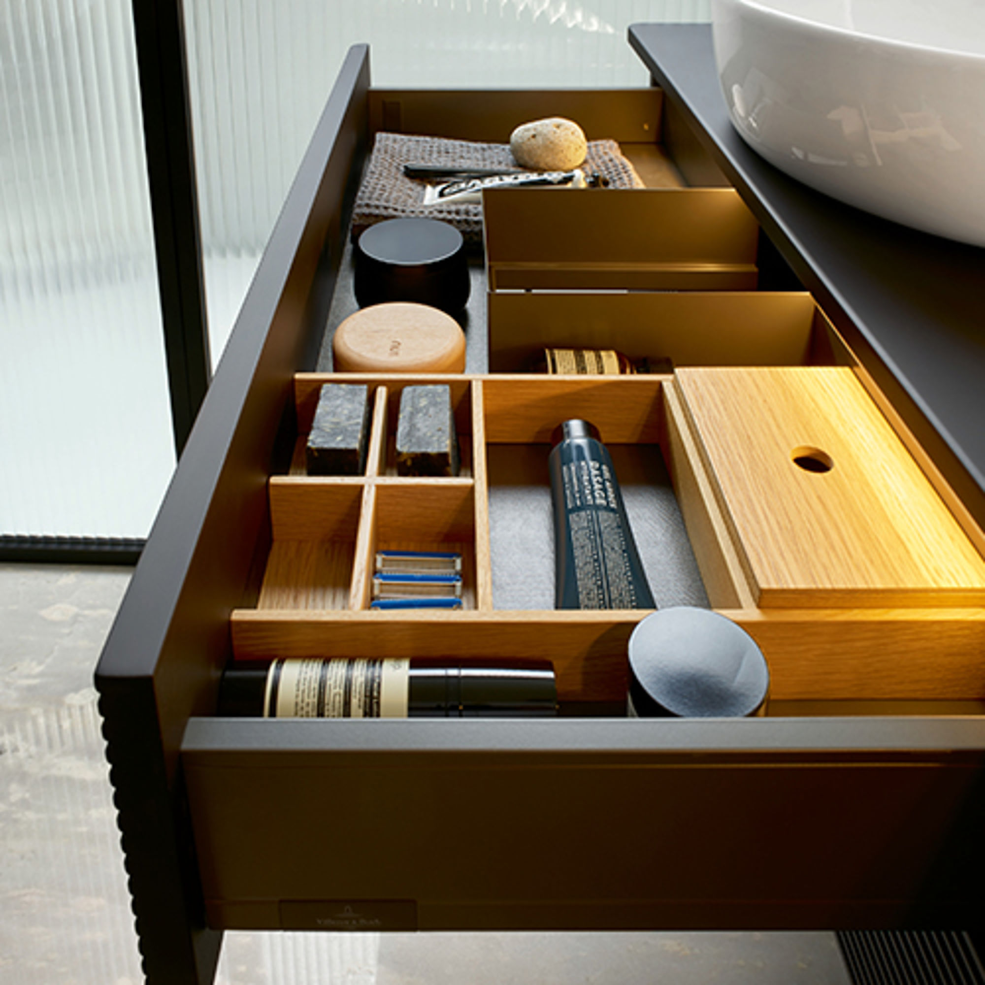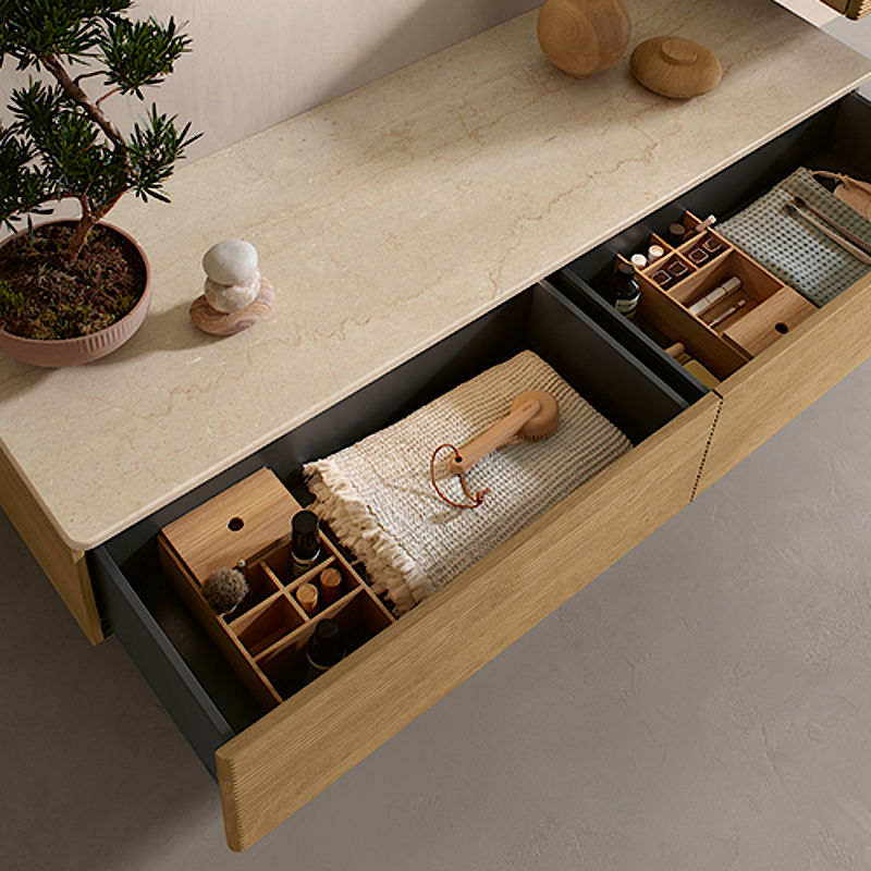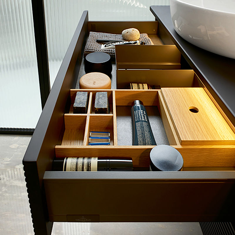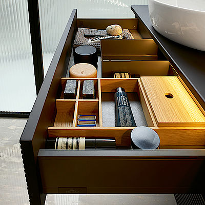 Unterbau und Platte lassen sich frei zusammenstellen – so sind nicht nur monochrome Varianten denkbar, sondern auch spannende Kombinationen wie ein Korpus aus Lack mit einer Platte aus Holz oder Marmor. Die Innenräume der Möbel sind klar strukturiert und lassen sich auf Wunsch mit schönen Einteilungsmodulen aus Eiche organisieren. Optional sorgt eine LED- Auszugsbeleuchtung für beste Übersicht – auch im Dunkeln. Das umfangreiche Möbelsortiment besteht aus verschieden großen Waschtischunterschränken bzw. Konsolen und einer Auswahl an Beimöbeln wie Sideboard, Highboard, Hoch- und Mittelschrank. So lässt sich jeder Raum perfekt strukturieren.