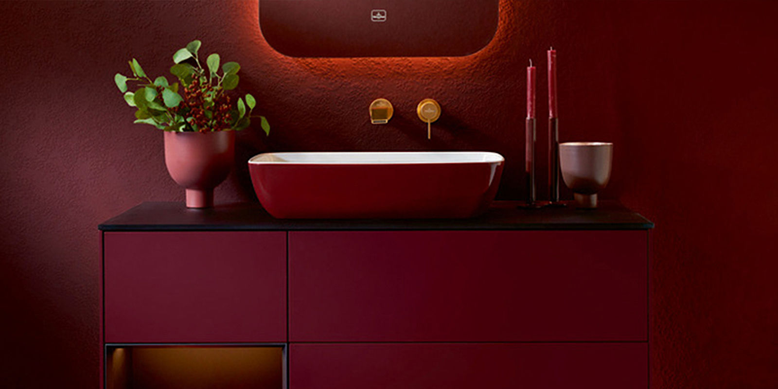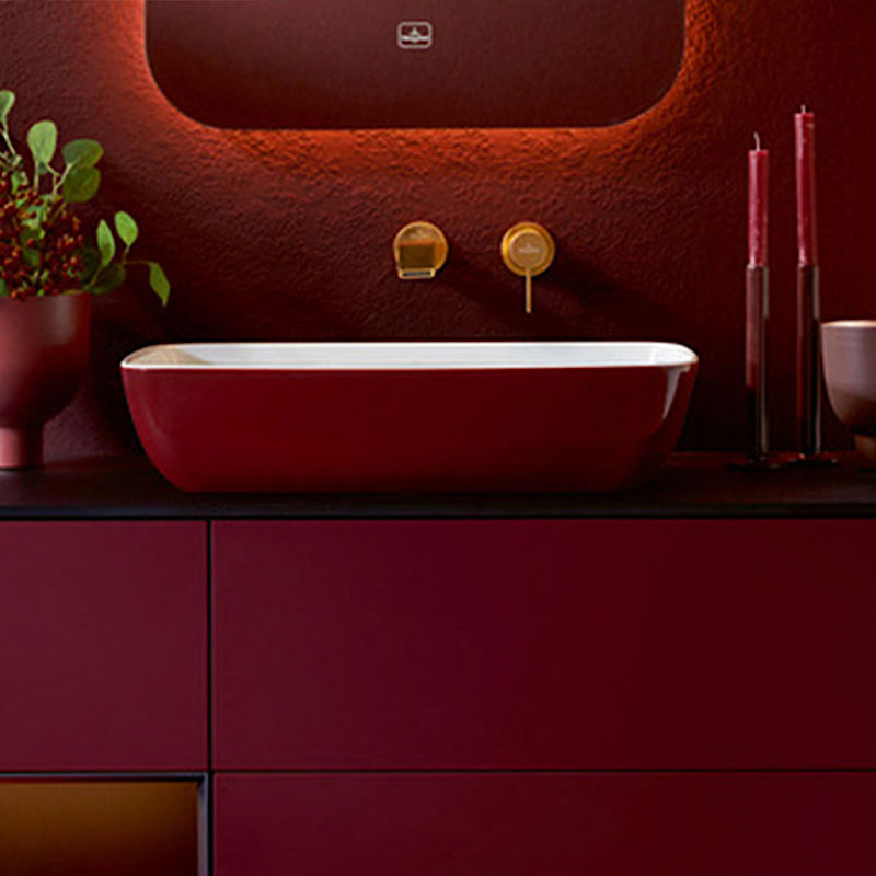 Ein rotes Artis-Waschbecken mischt sie beispielsweise nonchalant mit bordeauxroten Wänden, terracottafarbenen Fliesen und anderen monochromen Accessoires.