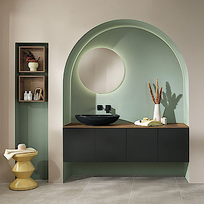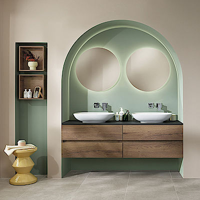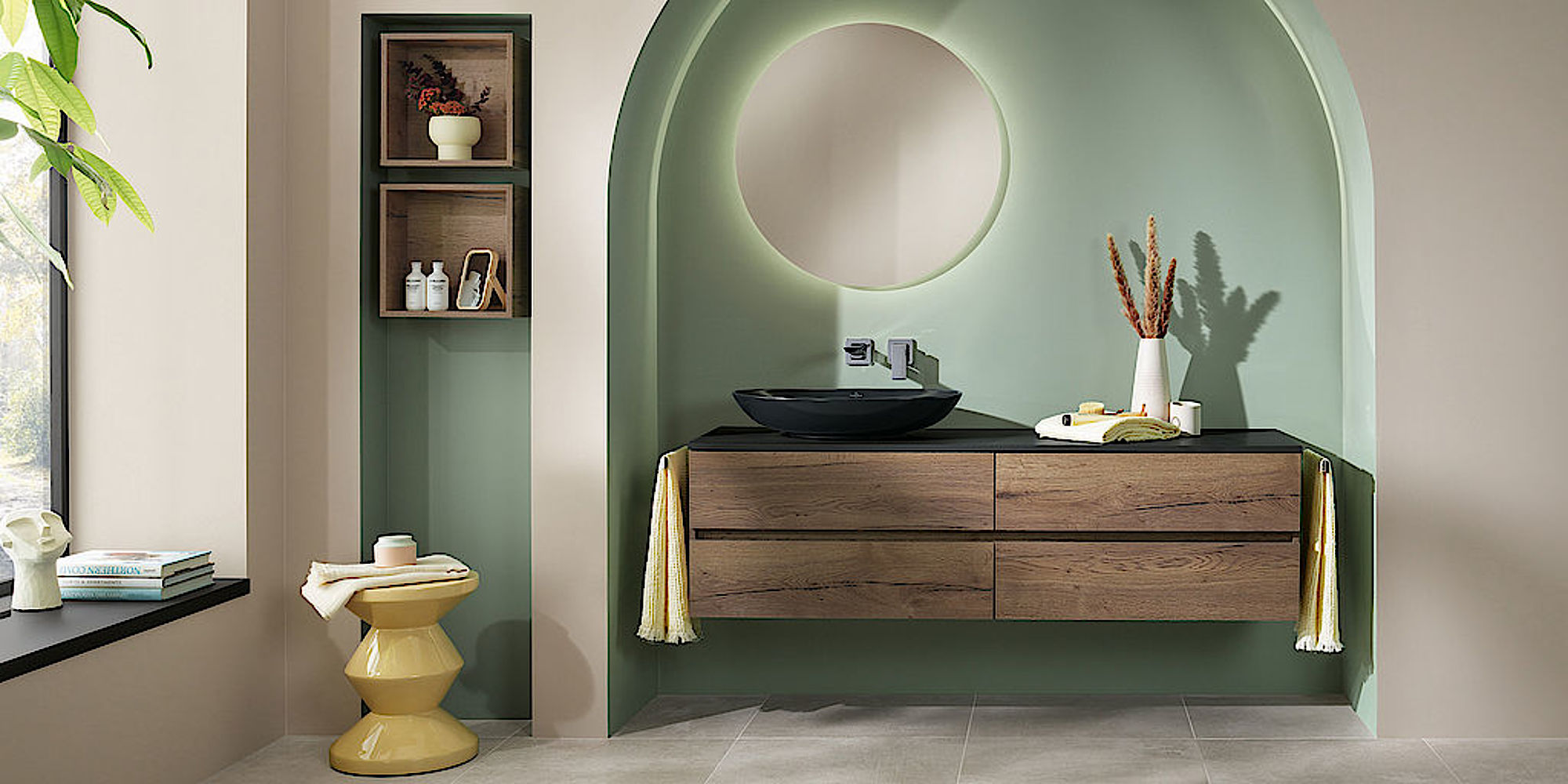 je nach Ton warme oder modern-reduzierte Atmosphäre im Bad erzeugen. Die hochwertigen Lackoberflächen,