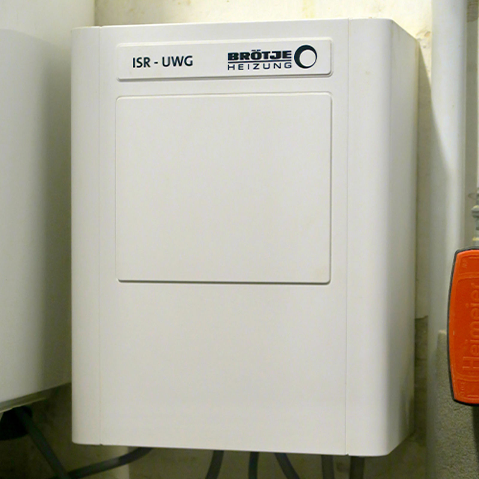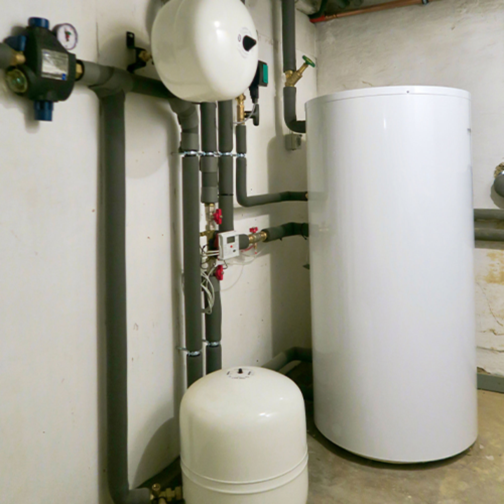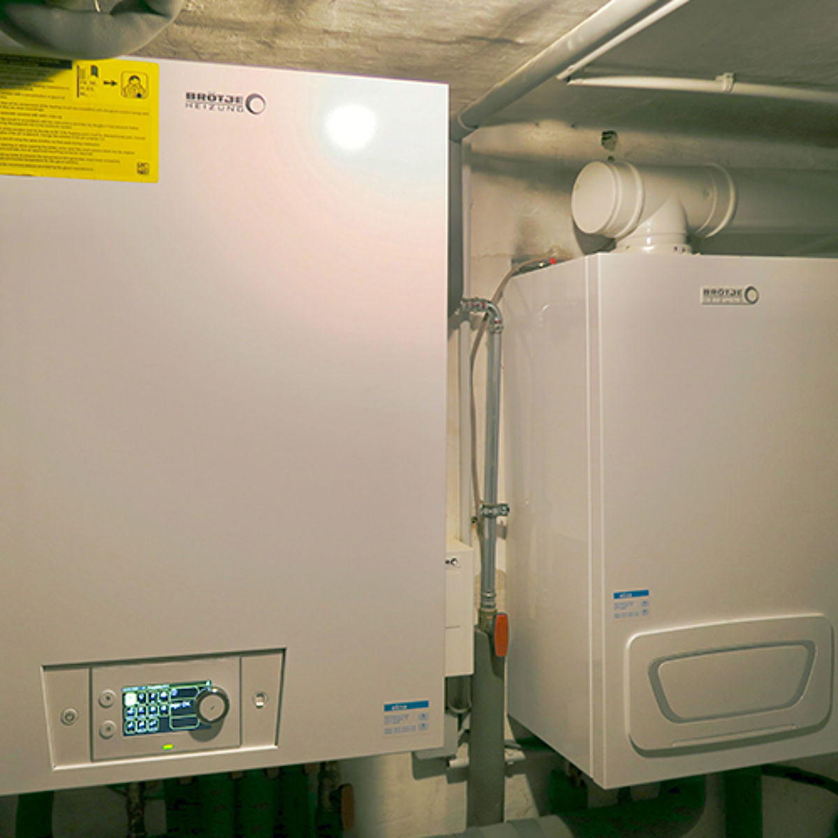 Auf der linken Seite im Heizungskeller befinden sich die Warmwasserverteilung und der 200 l-Warmwasserspeicher BRÖTJE EAS 200.