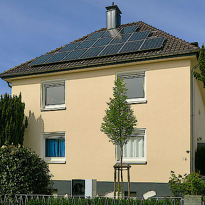Bei einer energetischen Sanierung macht schon die richtige Reihenfolge der Schritte einen bedeutenden Unterschied. Das gilt insbesondere für bislang völlig ungedämmte Gebäude, wie sie in der Vorkriegszeit üblich waren. Es wird kaum verwundern, dass die Eigentümer Investition in eine Photovoltaikanlage allen anderen Maßnahmen vorausschickte. Insgesamt 31 PV-Module mit je 320 Watt Leistung auf drei Seiten des Walmdachs sowie auf dem Flachanbau fangen das Sonnenlicht aus allen Himmelsrichtungen ein. Die Anlage hat eine Gesamtleistung von 9,92 kWp,
