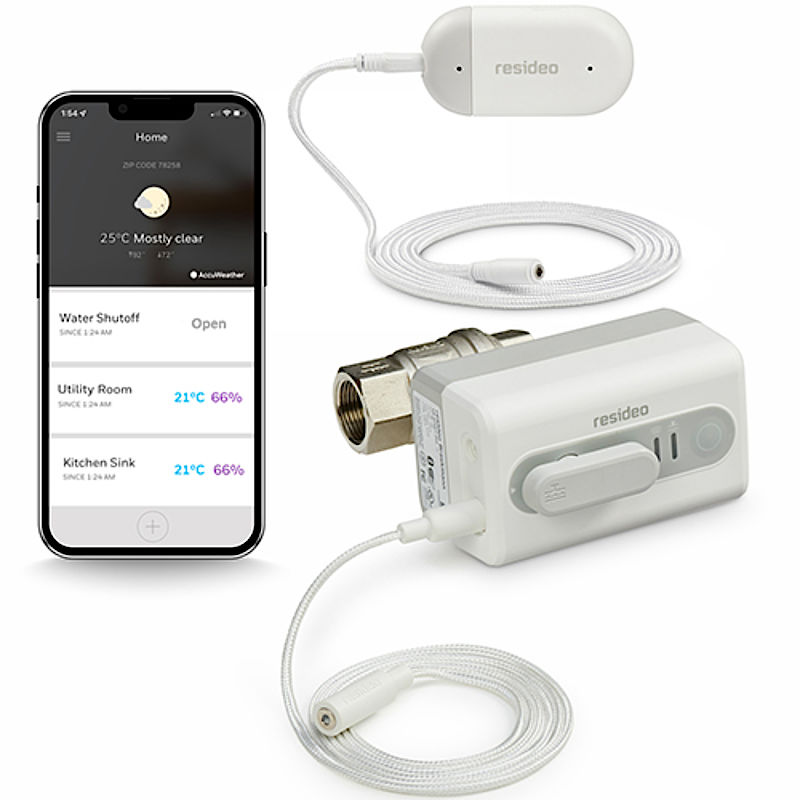 Der L1 WiFi Wasserleckage- und Frostmelder und das L5 WiFi Wasserleckage-Absperrventil – beide Produkte sind aufeinander abgestimmt und können bequem über die Resideo App gesteuert werden.