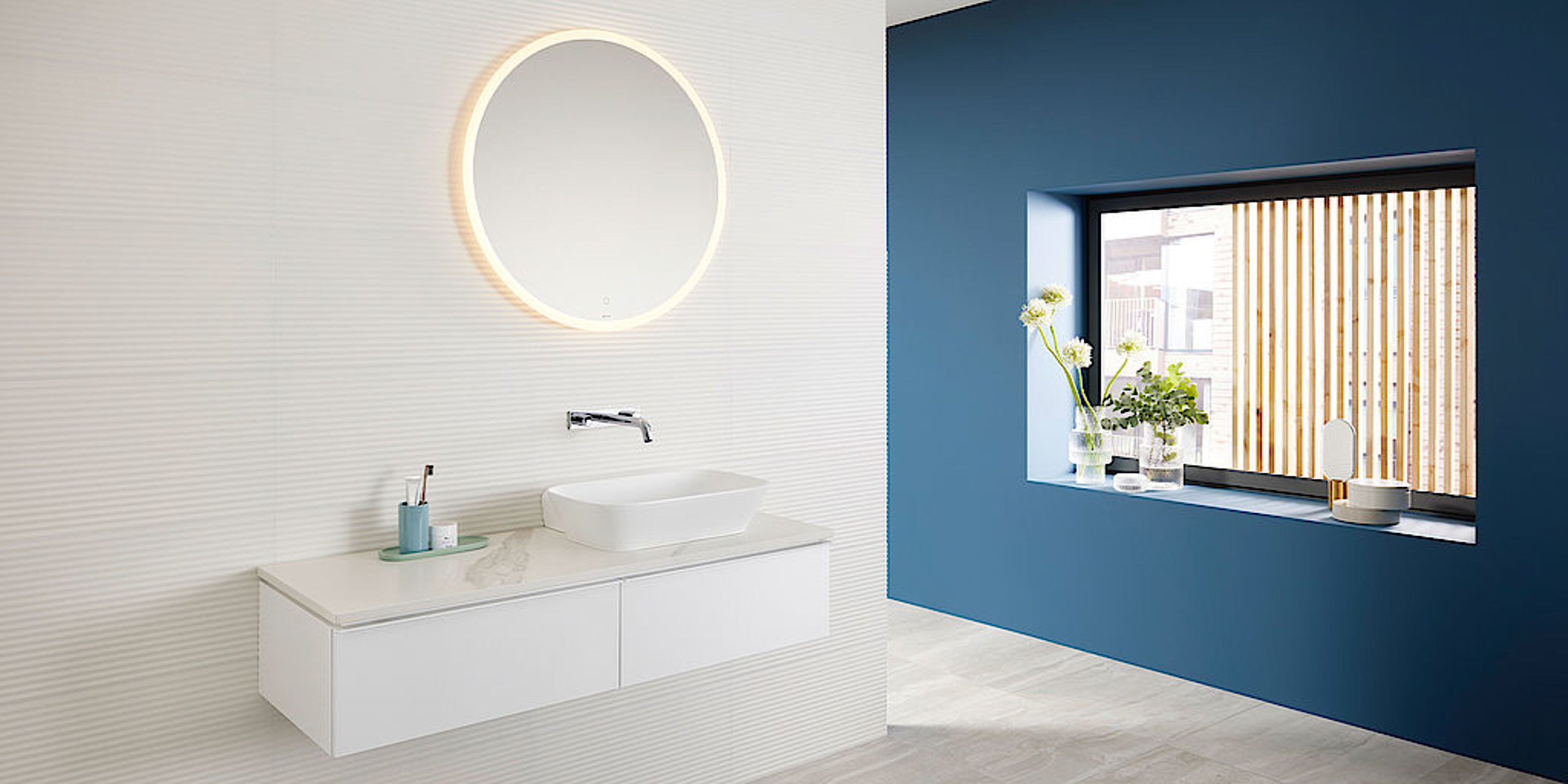 Geberit ONE Unterschrank, mit zwei Schubladen in der Farbe Nussbaum hickory, Geberit iCon Light Waschtisch 90 cm, Geberit Option Round Lichtspiegel mit direkter und indirekter Beleuchtung, Durchmesser 75cm.