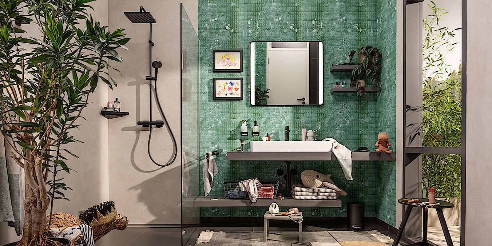 Auch dieses Konzept eines Familienbadezimmers leistet einen positiven Beitrag zur Schonung wertvoller Ressourcen. Rebris E und die Vernis Shape Showerpipe in markantem, kubischem Design überzeugen mit Wasser- und Energiespartechnologien.