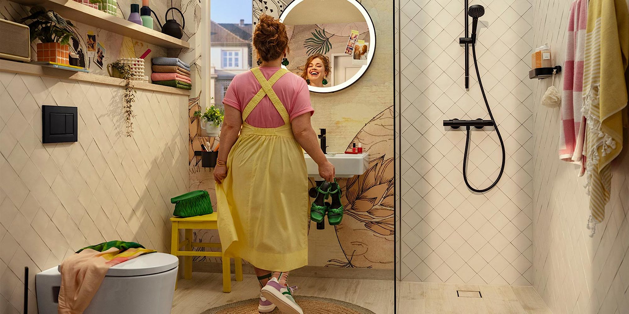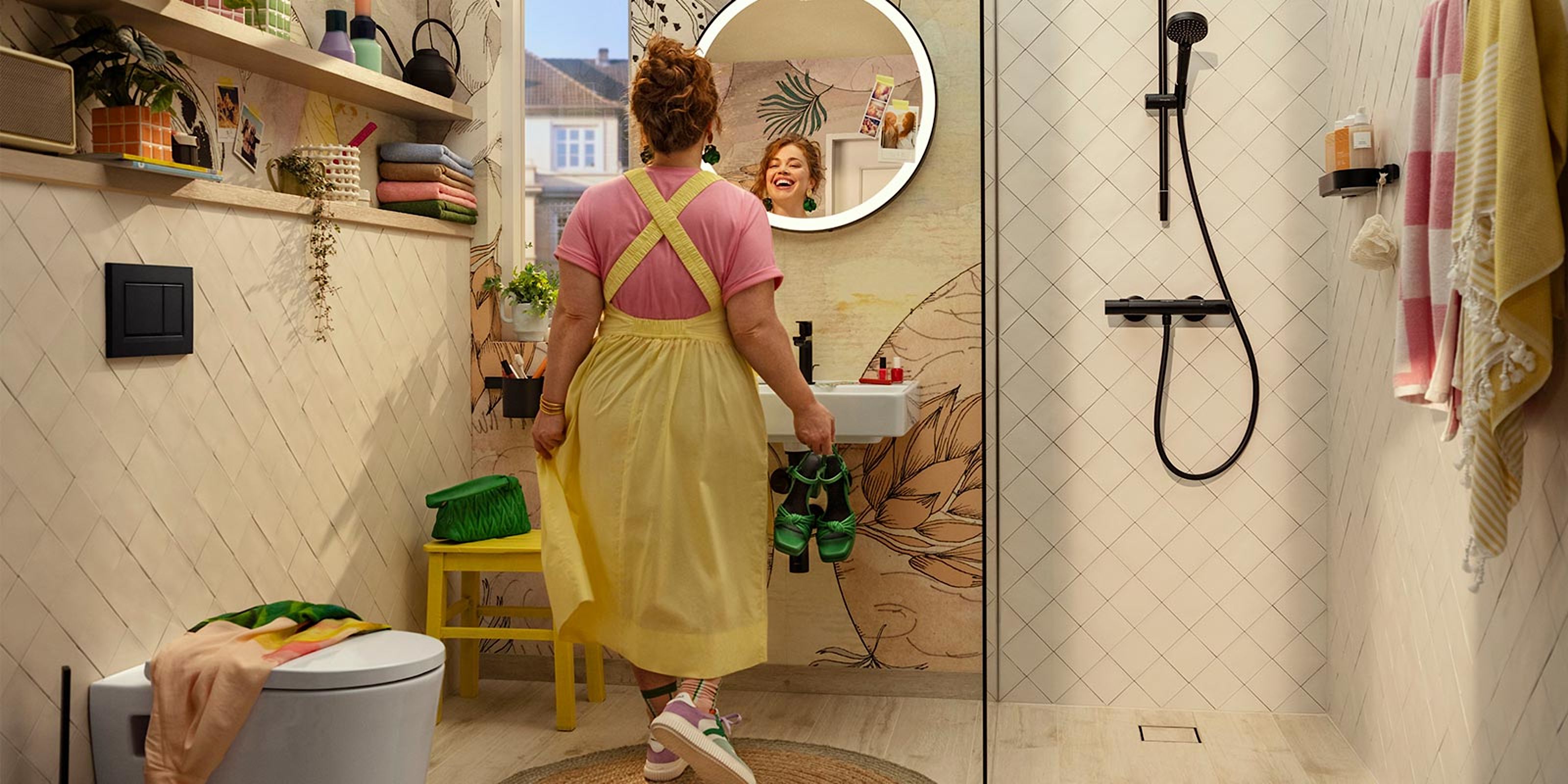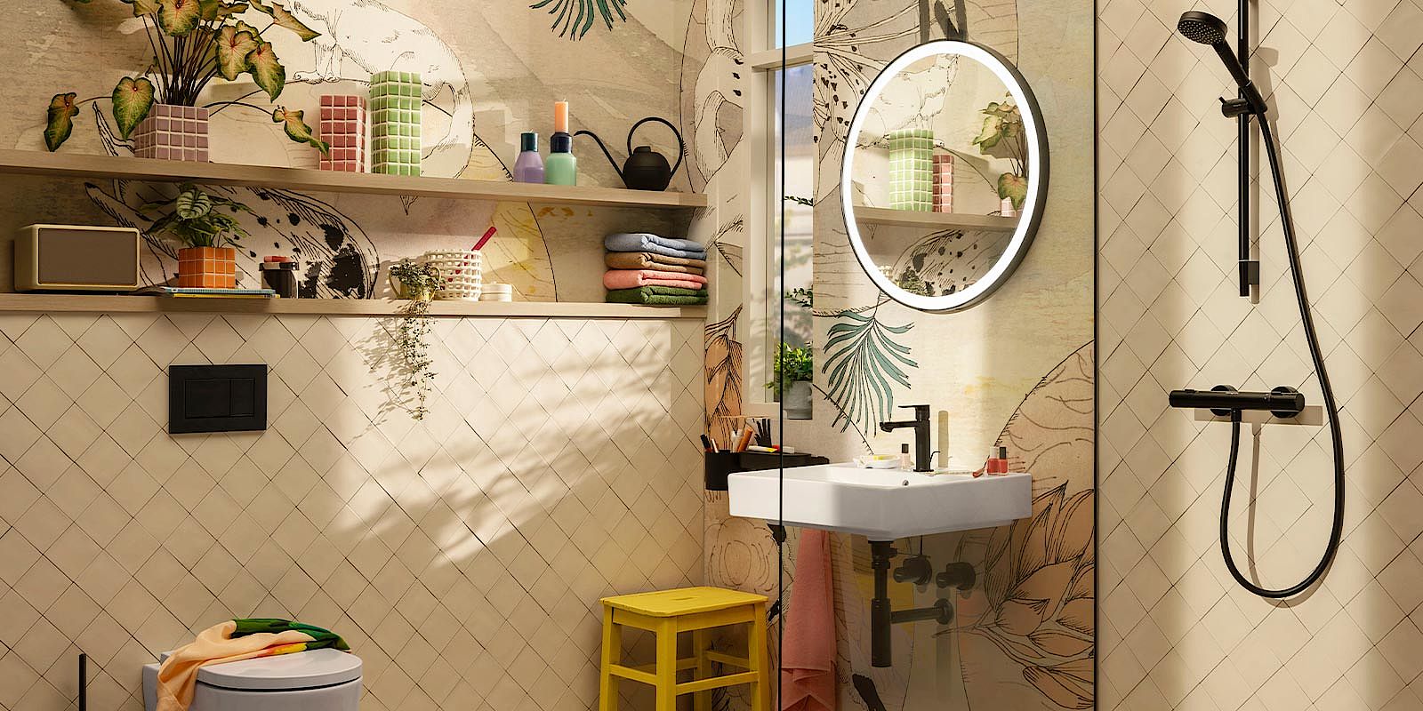 Die mattschwarzen Oberflächen der Rebris S Waschtischarmatur und des Xarita Lite Spiegels setzen vor der pastelligen Blumentapete moderne Akzente. Das Vernis Duschsystems gibt zudem einen markanten Kontrast zur hellen Fliese. Dank der innovativen hansgrohe EcoSmart+ Technologie unterstützt die Duschroutine einen noch umweltbewussteren Lebensstil. Die Handbrause verbraucht nur circa sechs Liter Wasser pro Minute, also rund sechzig Prozent weniger als herkömmliche hansgrohe Handbrausen. Rebris S verfügt zudem über CoolStart und lässt heißes Wasser nur fließen, wenn der Hebel aktiv bewegt wird. So verbraucht Rebris S nicht unnötig Energie für die Warmwasserbereitung.