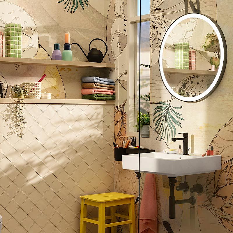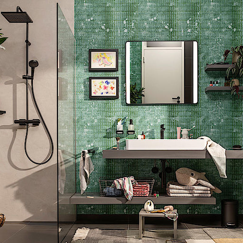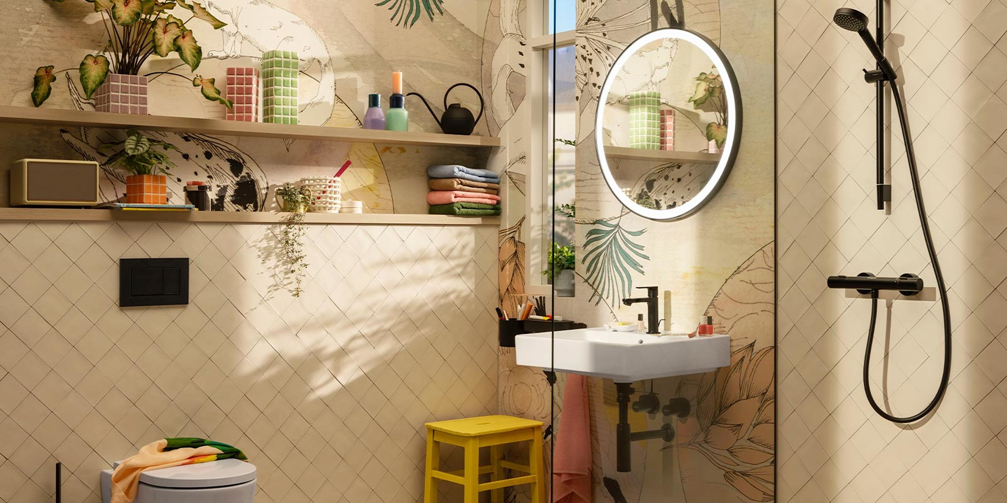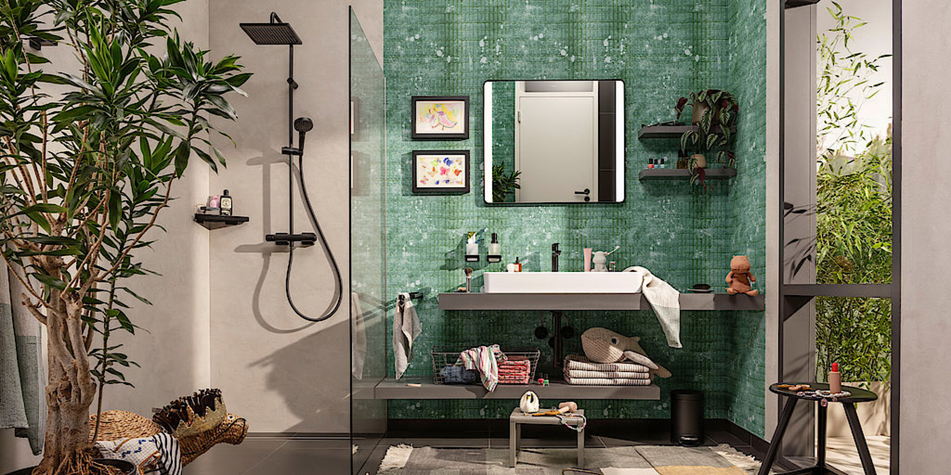 Die mattschwarzen Oberflächen der Rebris S Waschtischarmatur und des Xarita Lite Spiegels setzen vor der pastelligen Blumentapete moderne Akzente. Das Vernis Duschsystems gibt zudem einen markanten Kontrast zur hellen Fliese. Dank der innovativen hansgrohe EcoSmart+ Technologie unterstützt die Duschroutine einen noch umweltbewussteren Lebensstil. Die Handbrause verbraucht nur circa sechs Liter Wasser pro Minute, also rund sechzig Prozent weniger als herkömmliche hansgrohe Handbrausen. Rebris S verfügt zudem über CoolStart und lässt heißes Wasser nur fließen, wenn der Hebel aktiv bewegt wird. So verbraucht Rebris S nicht unnötig Energie für die Warmwasserbereitung.