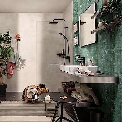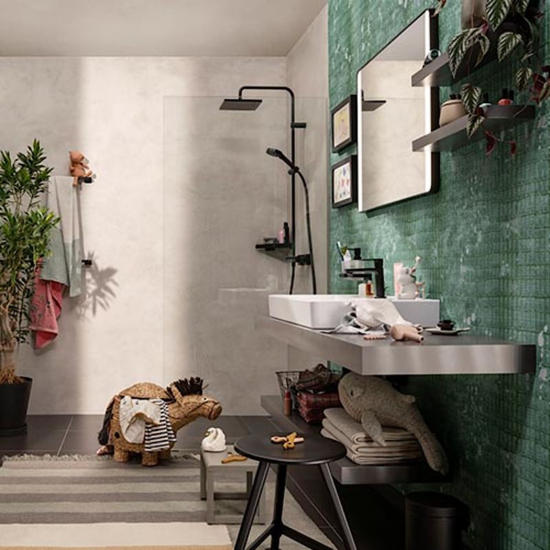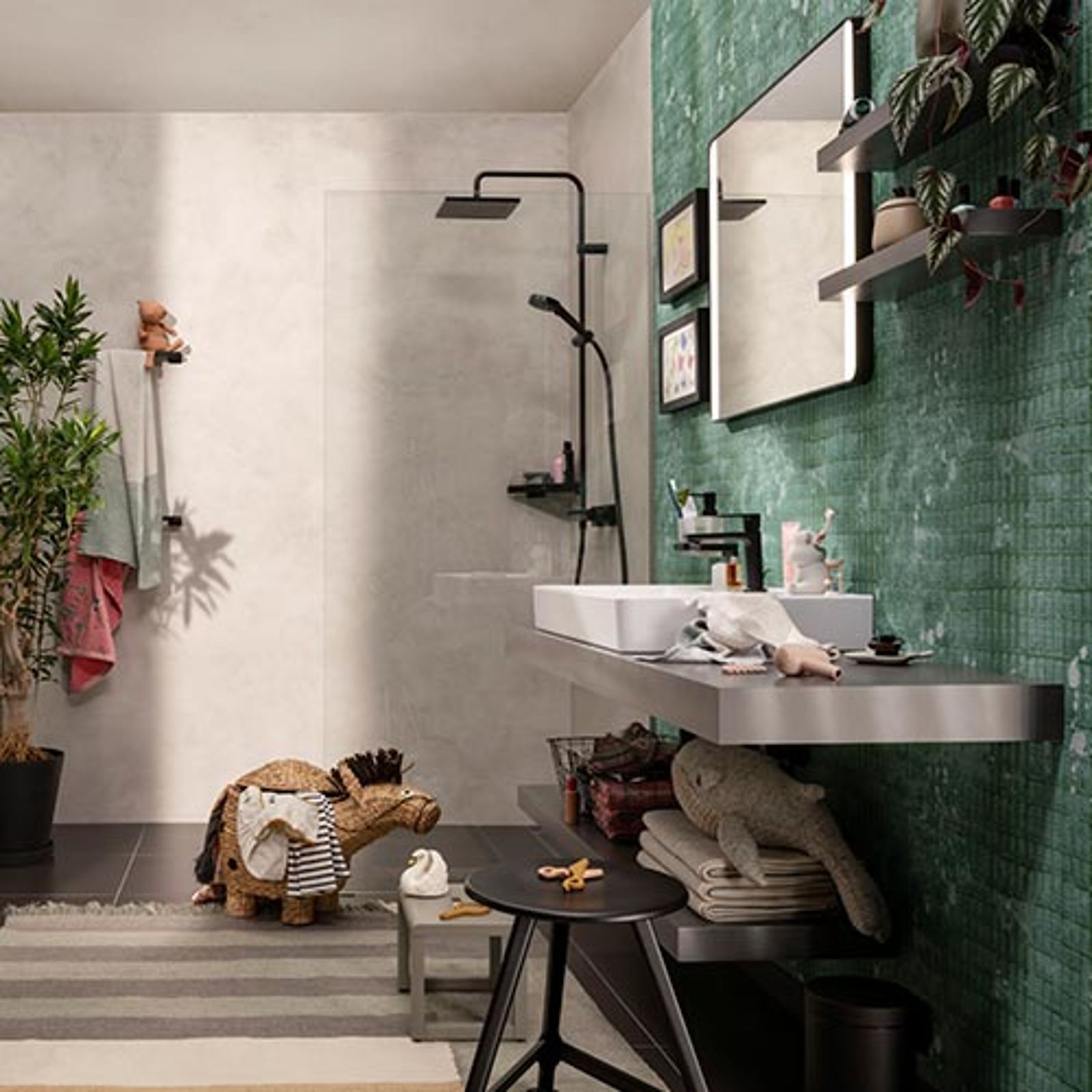 Sieben Quadratmeter reichen aus, um ein Traumbad zu verwirklichen, dass allen Anforderungen und Bedürfnisse eines hektischen Familienalltags gerecht wird. In jedem Detail spiegeln sich durchdachtes Design, innovative Technologien und eine langlebige Produktqualität wider. So entsteht eine liebevolle und moderne Atmosphäre, die tägliche Routinen und Abläufe im Badezimmer perfekt unterstützt, auch wenn es mal etwas chaotischer wird.