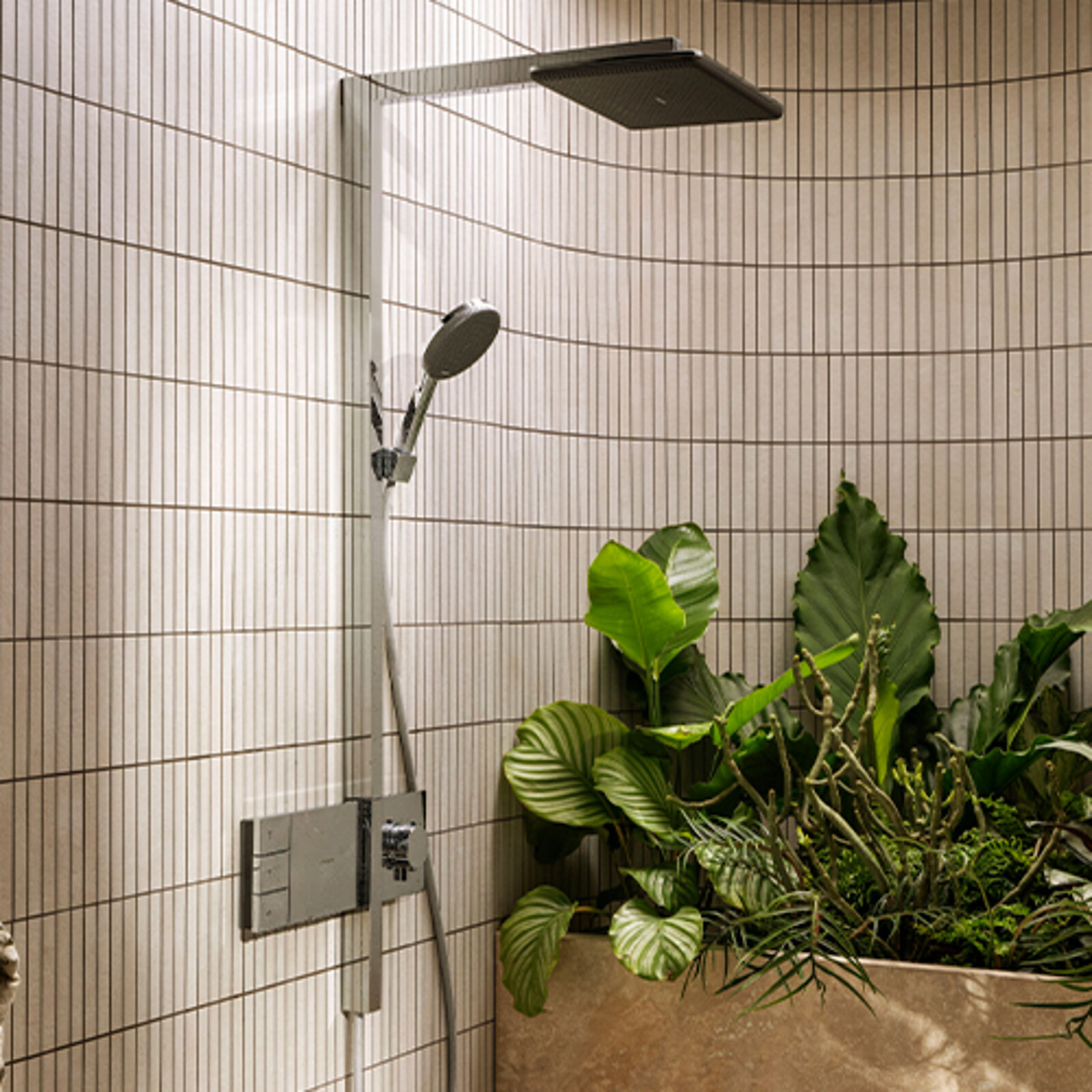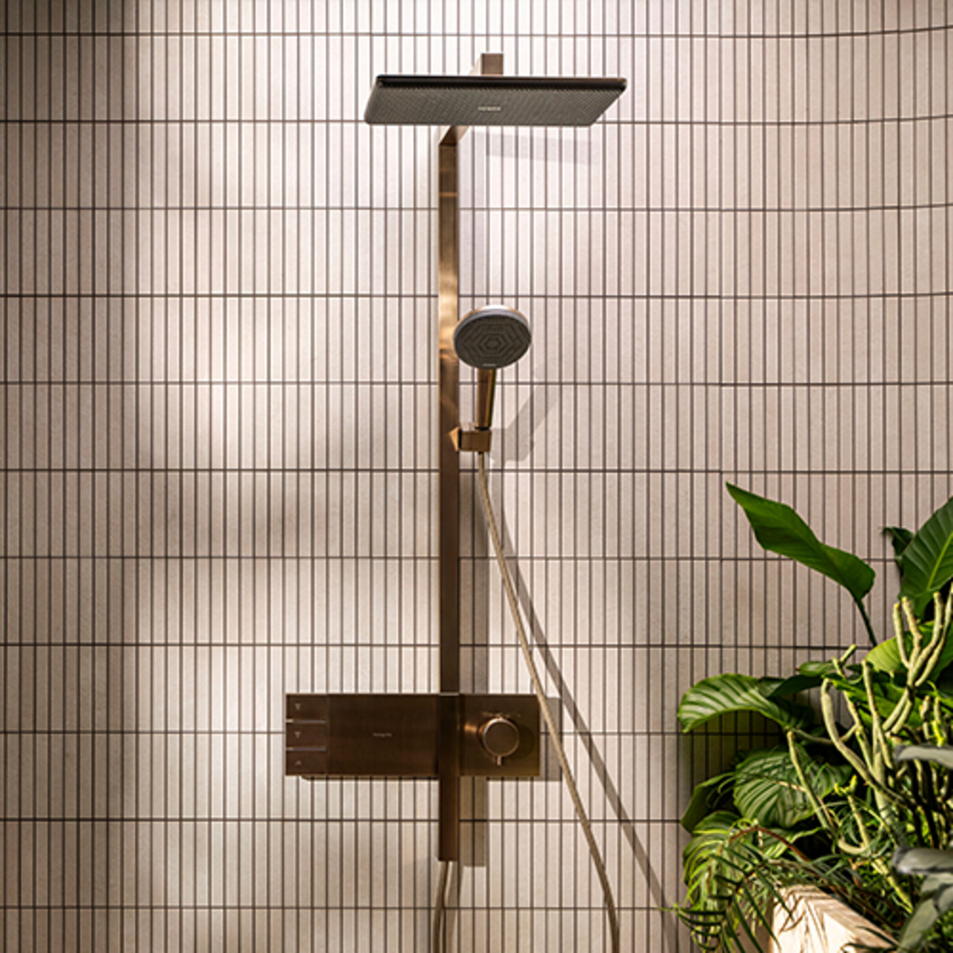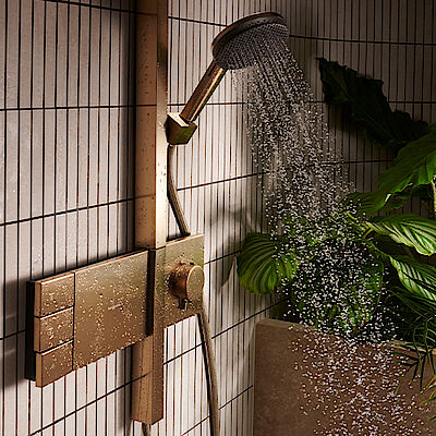 Obwohl die Raindance Alive Showerpipes technisch über ein normales Aufputzthermostat verfügen, wirken sie, als würde das Produkt mit der Wand verschmelzen. Dieser Effekt wird durch das geometrische Thermostat mit hochwertigem Messinggrundkörper und Zinkummantelung ermöglicht. Außerdem ist die Duschstange mit Aluminiumprofil durchgehend geradlinig weitergeführt, um diesen Effekt kunstvoll zu unterstreichen. Diese Lösung eignet sich optimal bei der Badsanierung. Ohne den kompletten Fliesenspiegel erneuern zu müssen, erreicht Raindance Alive die optische Anmutung von Unterputzmodulen.