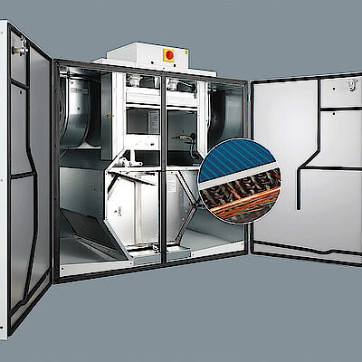 Das VALLOX DX-Register wird, je nach Lüftungsgerät, intern oder extern installiert. So können bei den VARIO Geräten sowohl bei der Stand- als auch der Deckenmontage externe DX-Register eingesetzt werden. Bei den VARIO V Geräten mit vertikalen Stutzen wiederum werden die DX-Register platzsparend direkt im Lüftungsgerät untergebracht.