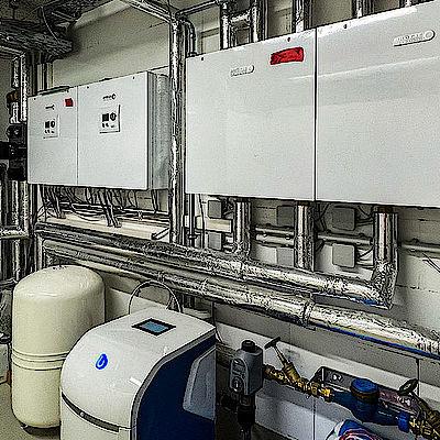 Das Brauchwasser fließt im Keller durch eine Entkalkungsanlage, die Erwärmung erfolgt dann dezentral über separate Durchlauferhitzer in jeder Mieteinheit. Das hat einige Vorteile: