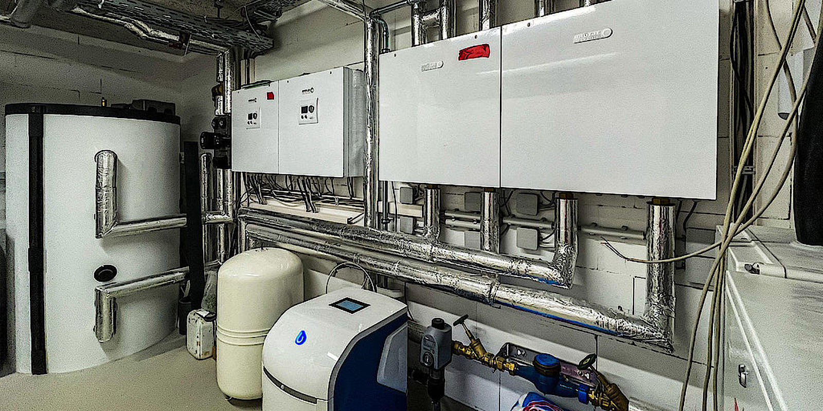 Bild Heizungskeller: links ein 850 l fassender Pufferspeicher, rechts die wandhängenden Inneneinheiten der Brötje Wärmepumpenkaskade.