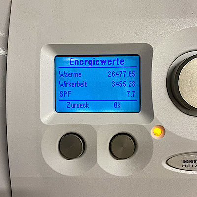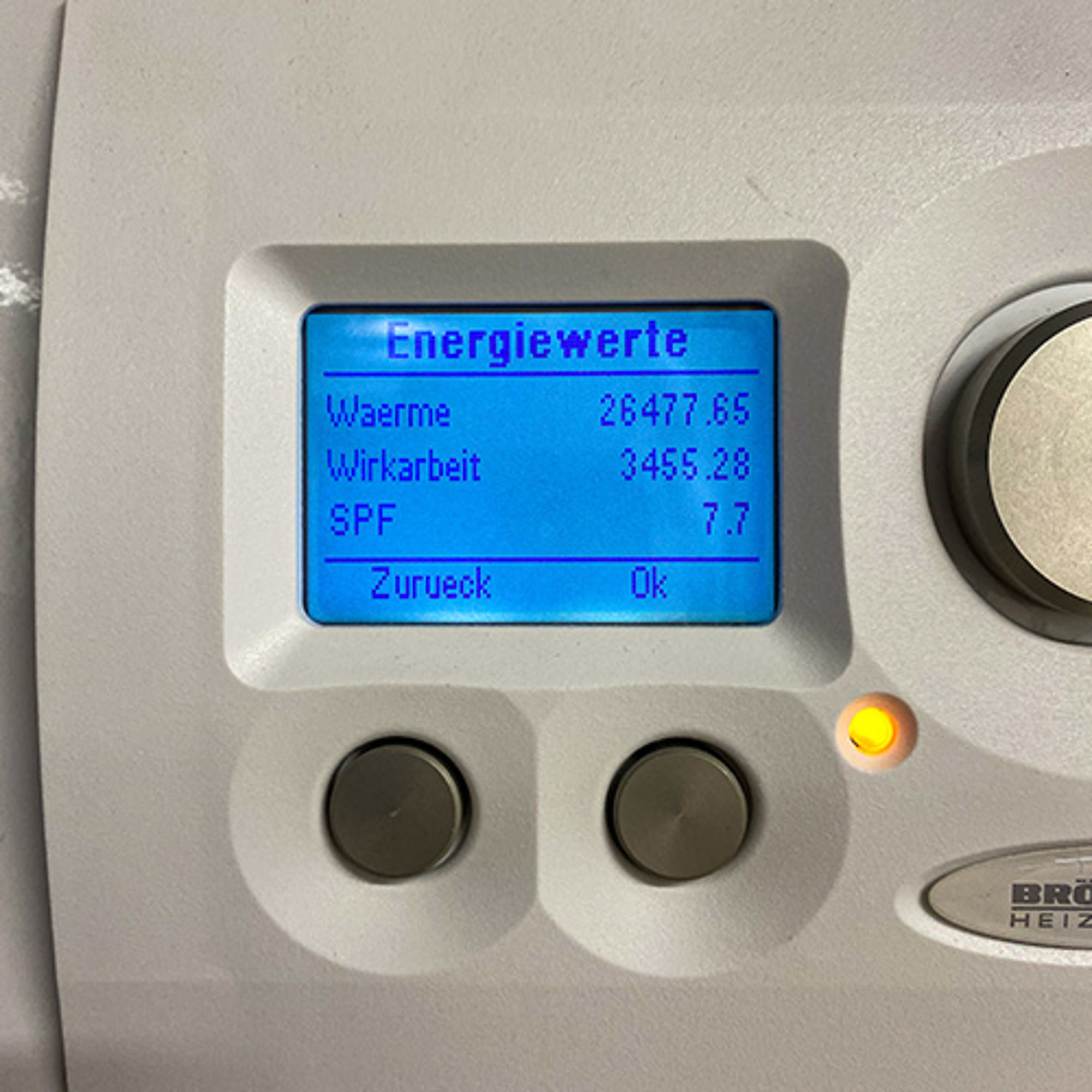 Der Blick ins Regelungsmenü der Luft-/Wasser-Wärmepumpe offenbart einen beachtlichen Wirksamkeitswert SPF 7.7.