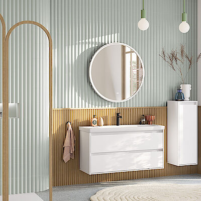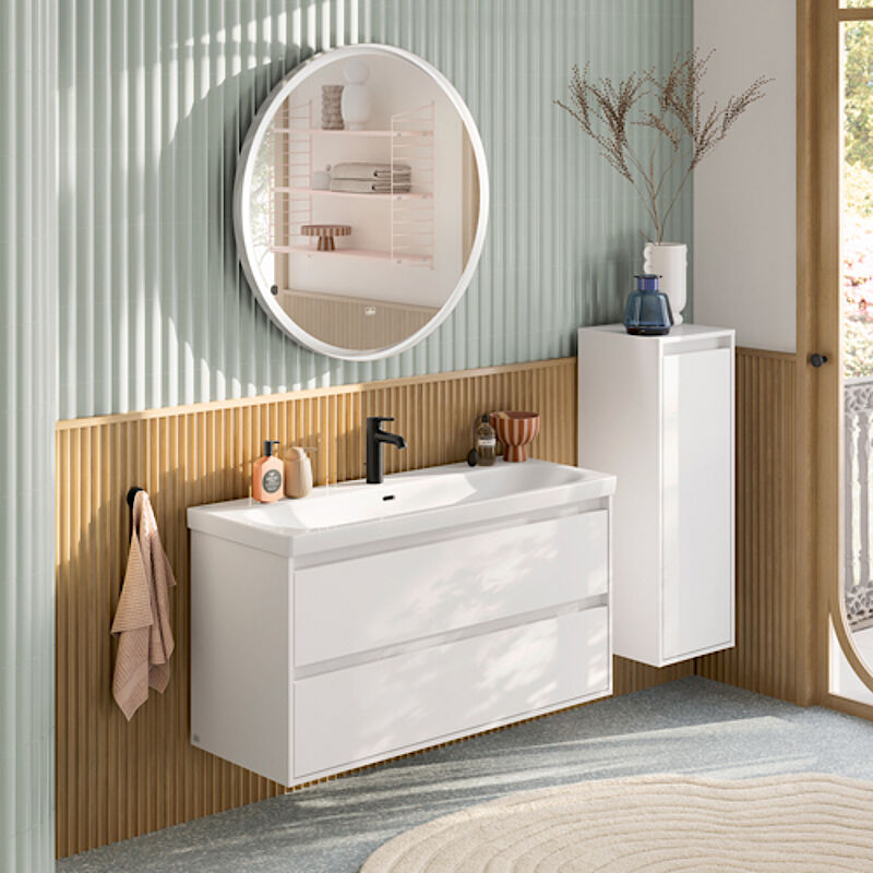 Die Vielseitigkeit von Skyla zeigt sich an der breiten Farbpalette und den flexiblen Größenoptionen. Acht moderne Farbtöne – von klassischem Brillant White über sanftes Soft Green bis hin zu warmem Nordic Oak – eröffnen zahlreiche Möglichkeiten für individuelle Looks. Auch bei den Größen bietet Skyla Spielraum: Mit sechs Varianten (von 55 bis 120 cm) passt sich der Schrankwaschtisch ideal an jede Raumgröße an. Auf Wunsch sind die Unterschränke mit einer oder zwei Schubladen erhältlich, wobei die Modelle in den Breiten 80 und 100 cm zusätzlich mit einem offenen Fach kombiniert werden können – die perfekte Ergänzung zum asymmetrischen Waschbecken.